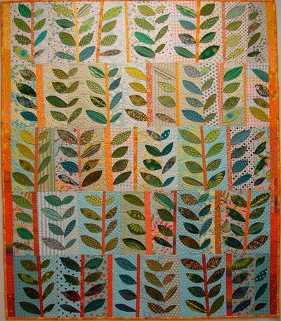 Ce n’est certainement pas un hasard si tu as fait ces magnifiques branchages maintenant. Les arbres pour l’Australie mais aussi ton combat pour « ta » forêt et la nature en général y sont pour quelque chose. Ces feuilles coupées au hasard dans de si belles couleur et appliquées simplement ont du être bien salutaires et je suis certaine que tu sauras concocter une bordure lumineuse. Quant au quilting, le temps libre que tu vas avoir involontairement te permettra de le mener à bien.