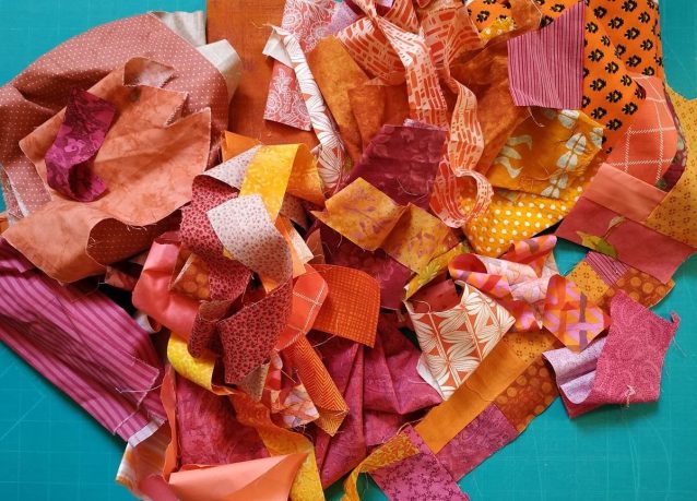 Ah si tu savais comme j’hésite pour le quilting, main au coton perlé ou machine ?… Non, il n’est pas terminé !! Je suis en train d’assembler des tissus pour faire un dos très scrappy…