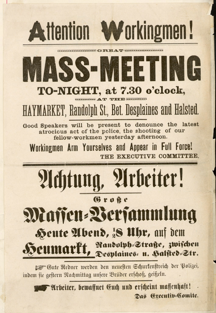 Si le mouvement commença chez McCormick, couvant déjà depuis des mois, il s’étendit en grève générale du 1er au 4 mai 1886 pour se terminer dans un bain de sang le soir du 4, sur la place Haymarket de Chicago.