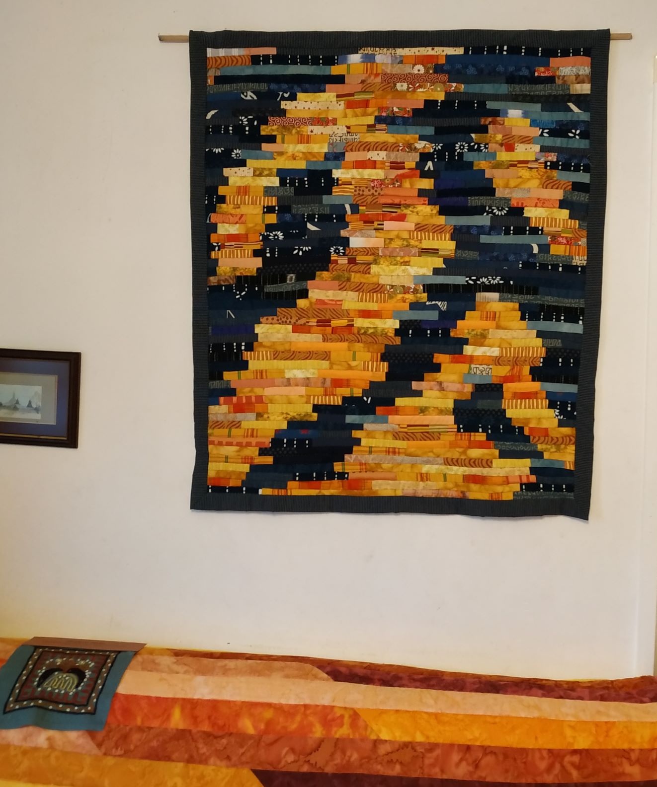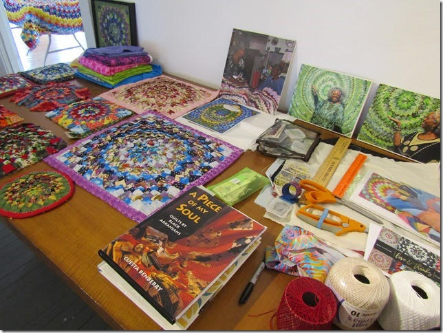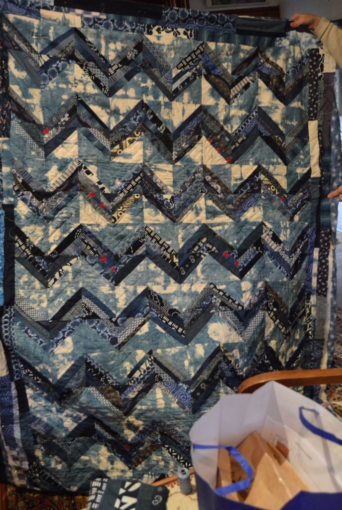 Martine et moi, ce sont de longs mails depuis des années, des confidences, les partages des joies et des peines, alors qu’objectivement nous nous connaissons peu. Mais c’est ainsi l’amitié ! Tout chez elle est souvenirs et artisanats. Voici quelques quilts de Martine, je n’en ai photographié que quelques-uns, trop occupée à discuter !!