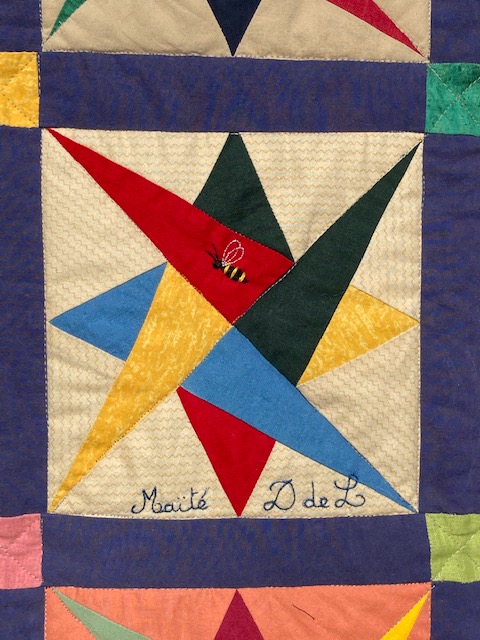Pour quelques jours, je cède ma place à Maïté, notre chère amie quilteuse. C’est sans doute la plus productive de nous toutes, ce n’est pas peu dire ! Nous admirons sa reconversion : elle qui préférait les appliqués minutieux à la main et les fines broderies, Maïté continue autrement, avec sa machine, détournant ses problèmes de dextérité… Même le quilting machine ne lui fait pas peur ! Un jour, un quilt…