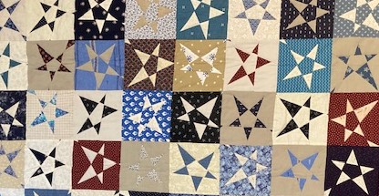 Voici Poussières d’étoiles pour les 50 ans de mon fils aîné Antoine avec la méthode rapide au cutter que nous a expliquée Chantal (voir le très beau patchwork réversible qu’elle a fait avec les tissus de sa maman).