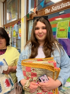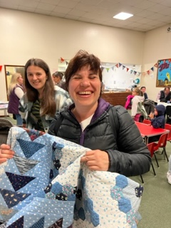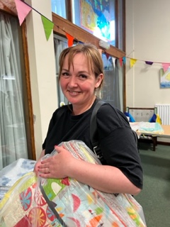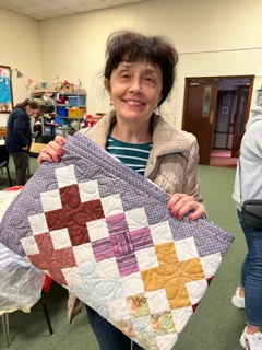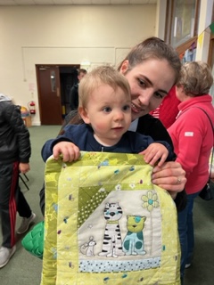 Valerie sans accent faisait partie de la Ruche, c’est notre adorable amie britannique. Malheureusement, le Brexit est passé par là et il leur devenait trop périlleux de continuer à vivre en France. Maïté échange souvent des nouvelles avec elle, moi un peu moins mais quand nous le faisons, c’est comme nous nous étions quittées la veille. A la suite de l’article de lundi, elle nous a contactées car justement le soir-même, 36 quilts faits par son club allaient être offerts aux réfugiés ukrainiens de leur petite ville du Nord-Est de l’Angleterre. Photos demandées à Valerie, photos obtenues ! Je les mets toutes avec joie car ce post leur sera transmis (on parle d’eux en France !!). Le premier petit garçon s’appelle Nikita, nous n’avons pas les autres prénoms :