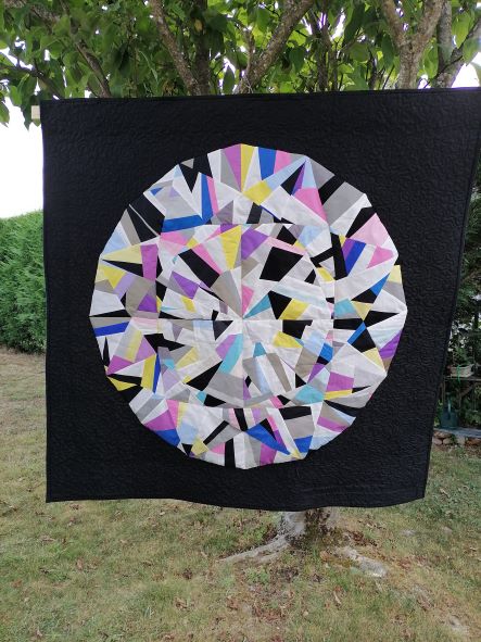 J’imaginais que cela serait compliqué à faire, mais non, avec méthode et régularité on y arrive, j’ai utilisé le schéma proposé et modifié seulement la façon de le coudre, avec des restes de tissus variés pour faire étinceler ce quilt de toutes ses facettes.