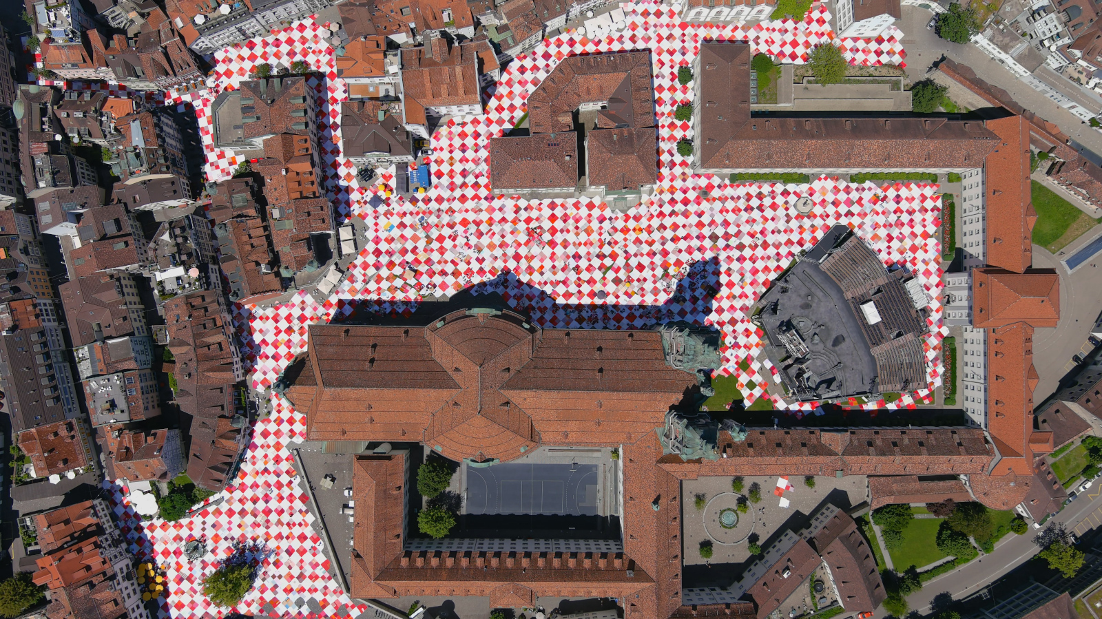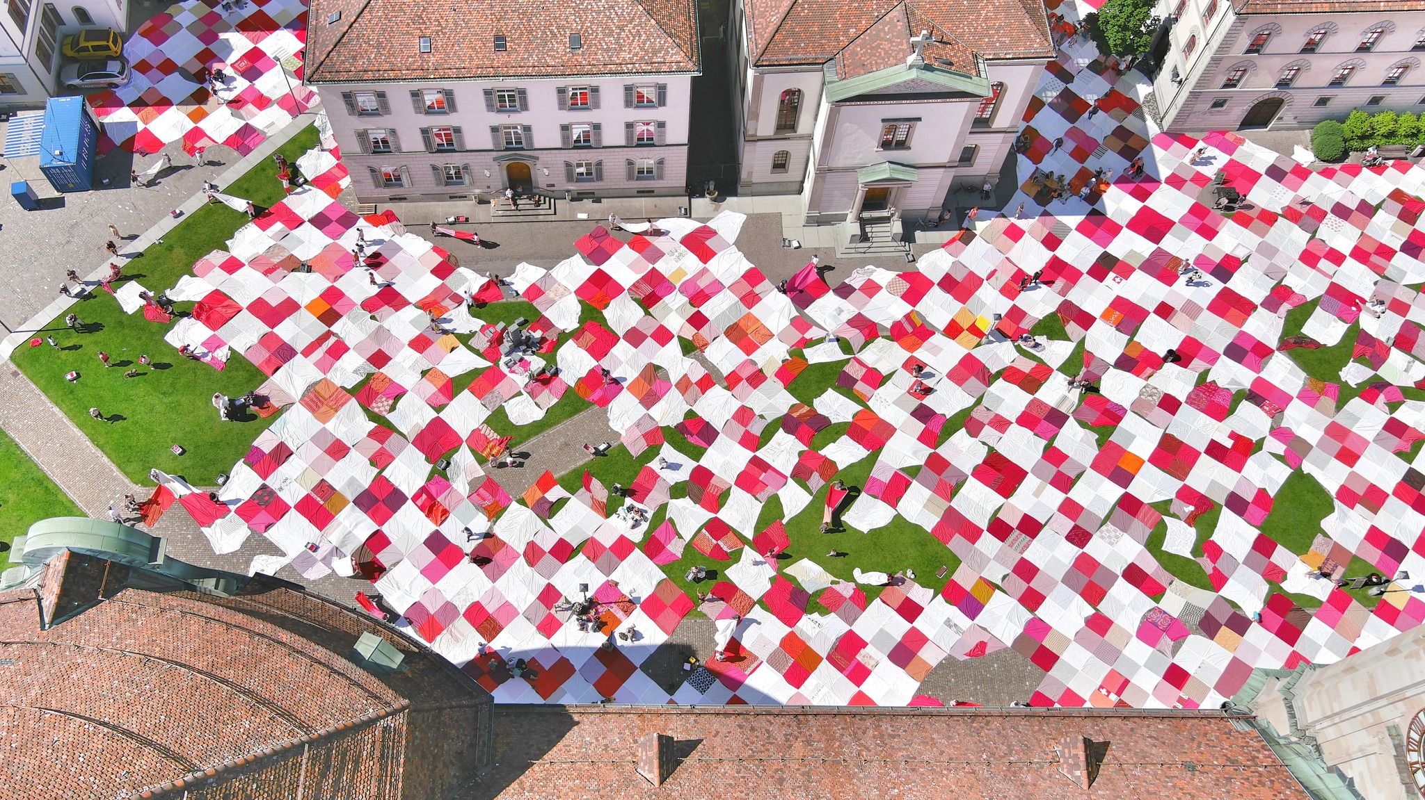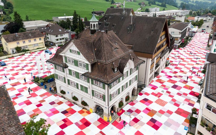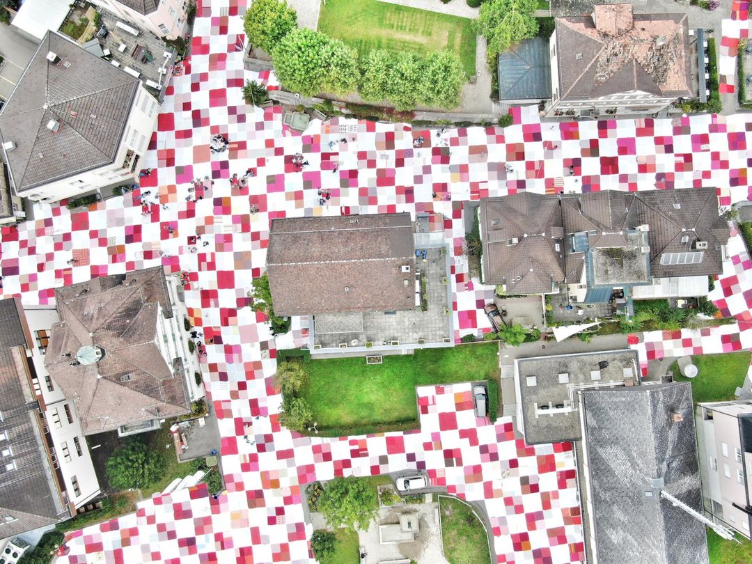 Ein Dorf mit Tüchern ausgemalt – 2019 in Trogen (Copyright: Helikopter-Service Triet-AG) – Dans le village de Trogen, en 2019
