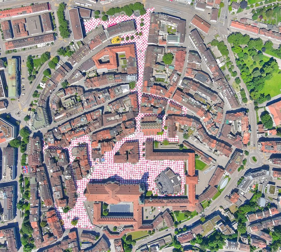 Saint-Gall, 2022, que c’est beau… et c’est l’occasion de déambuler en ville en chaussettes ou pieds nus, pour respecter la propreté des nappes.