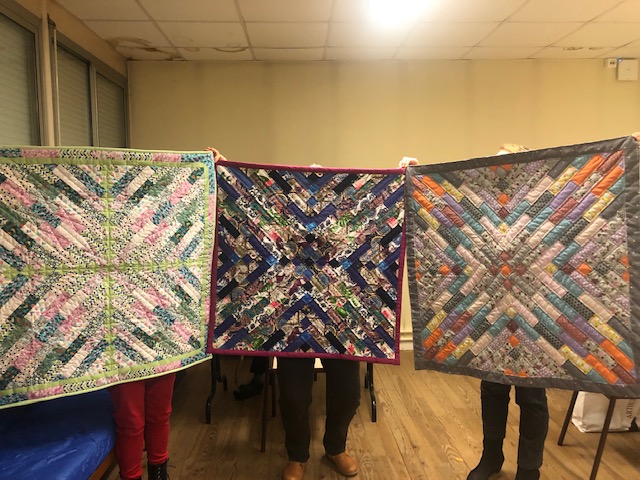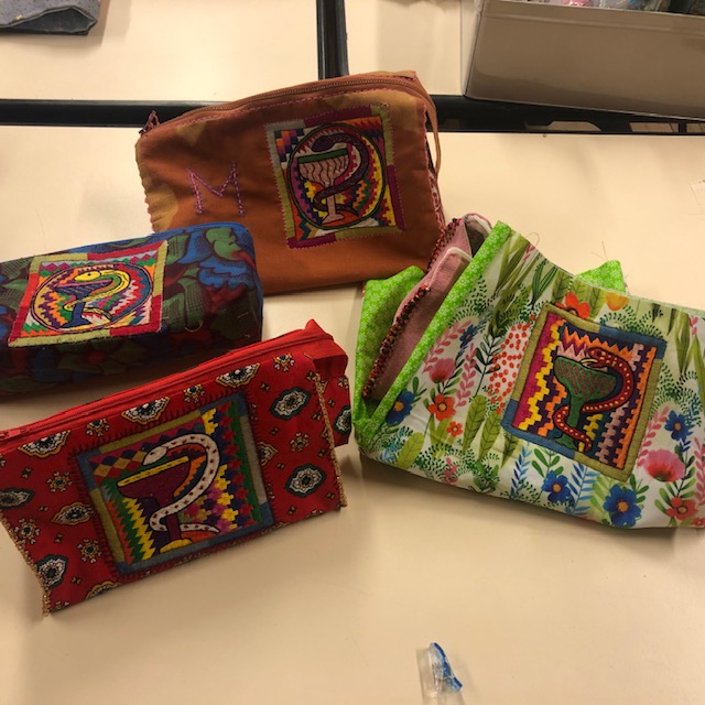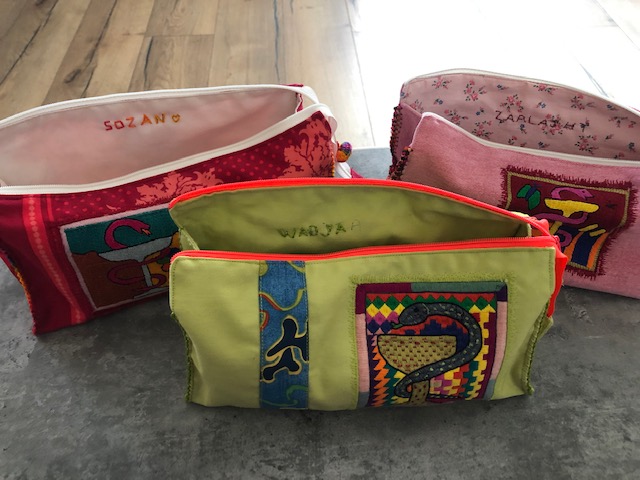 Sylvie anime un mini-club de 7 quilteuses, elles se réunissent tous les 15 jours. Souhaitons-leur une très belle année créative ! C’est bien parti, regardez ces jolies trousses aux broderies afghanes, avec le nom de la brodeuse brodé à l’intérieur, ne sont-elles pas adorables ?
