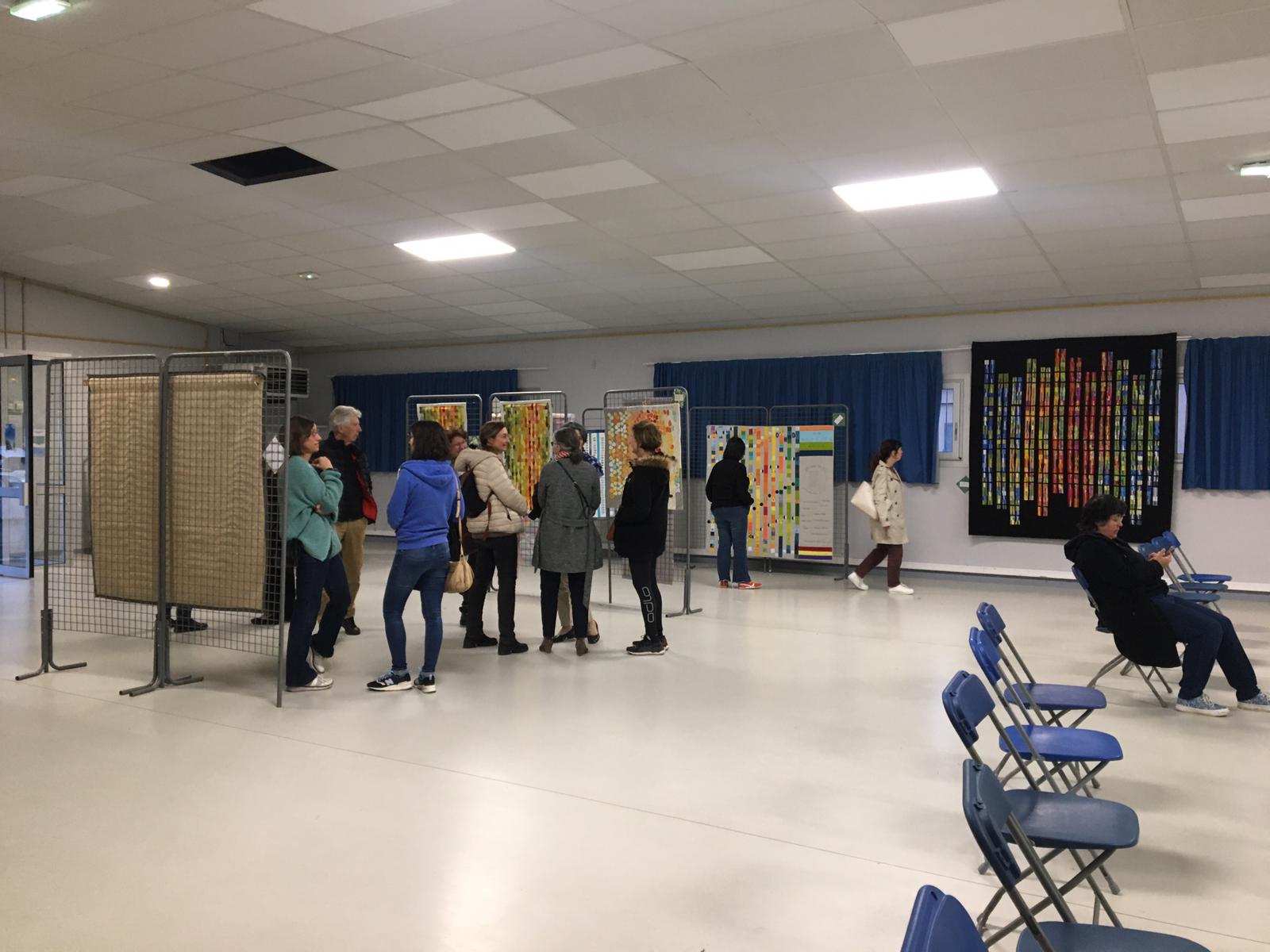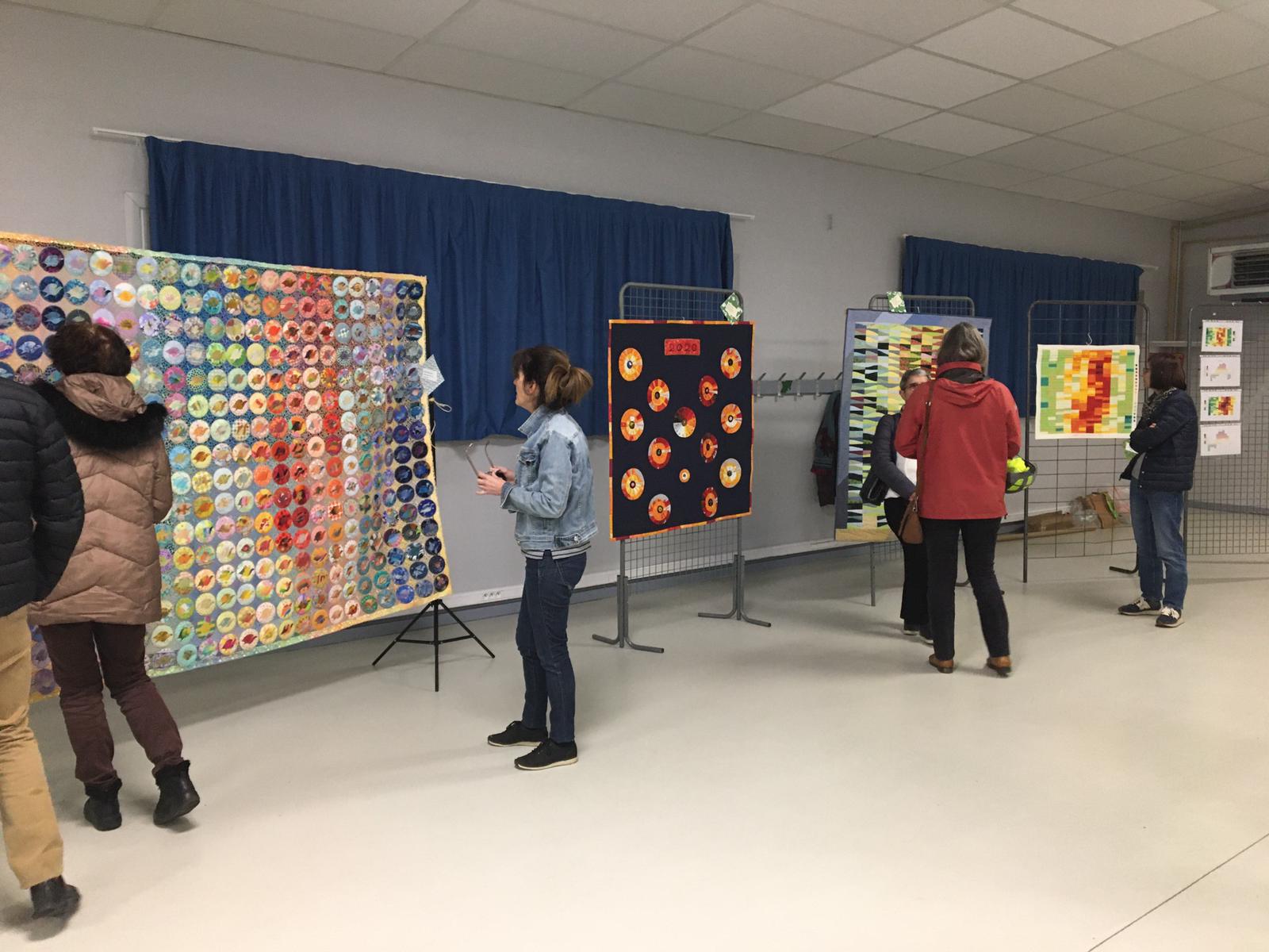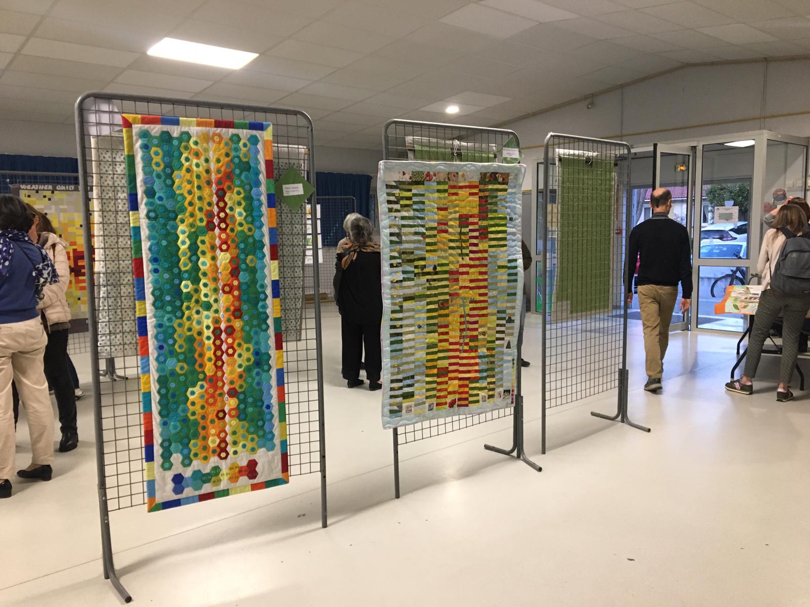 Une bonne trentaine de personnes, intéressées par le sujet du climat, ont longuement admiré les quilts, posé des questions, ont été interpelés par la diversité des traitements d’un même thème a priori rébarbatif : le relevé de la température, jour après jour, pendant une année ! Il faut dire que ces quilts-météo sont extraordinaires, j’ai ressenti beaucoup de joie en montrant cette facette de notre art !