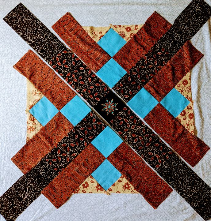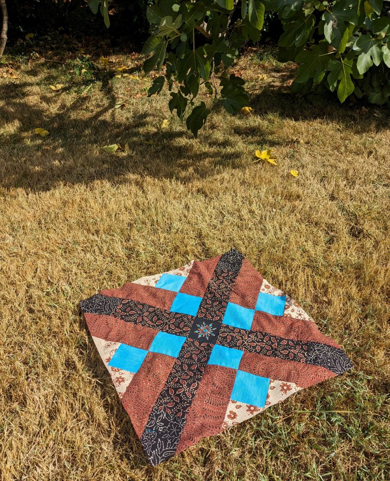La réussite de ce modèle réside dans l’observation des règles du patchwork traditionnel : de la précision dans la coupe, la couture, notamment la constance de la marge de couture. Les tissus Neelam étant fins et mous (sans traitements industriels), je les raidis avec une bombe d’aide au repassage (style Fabulon). On peut les entoiler si on préfère, ou se débrouiller tel quel, après un simple repassage.