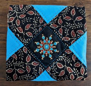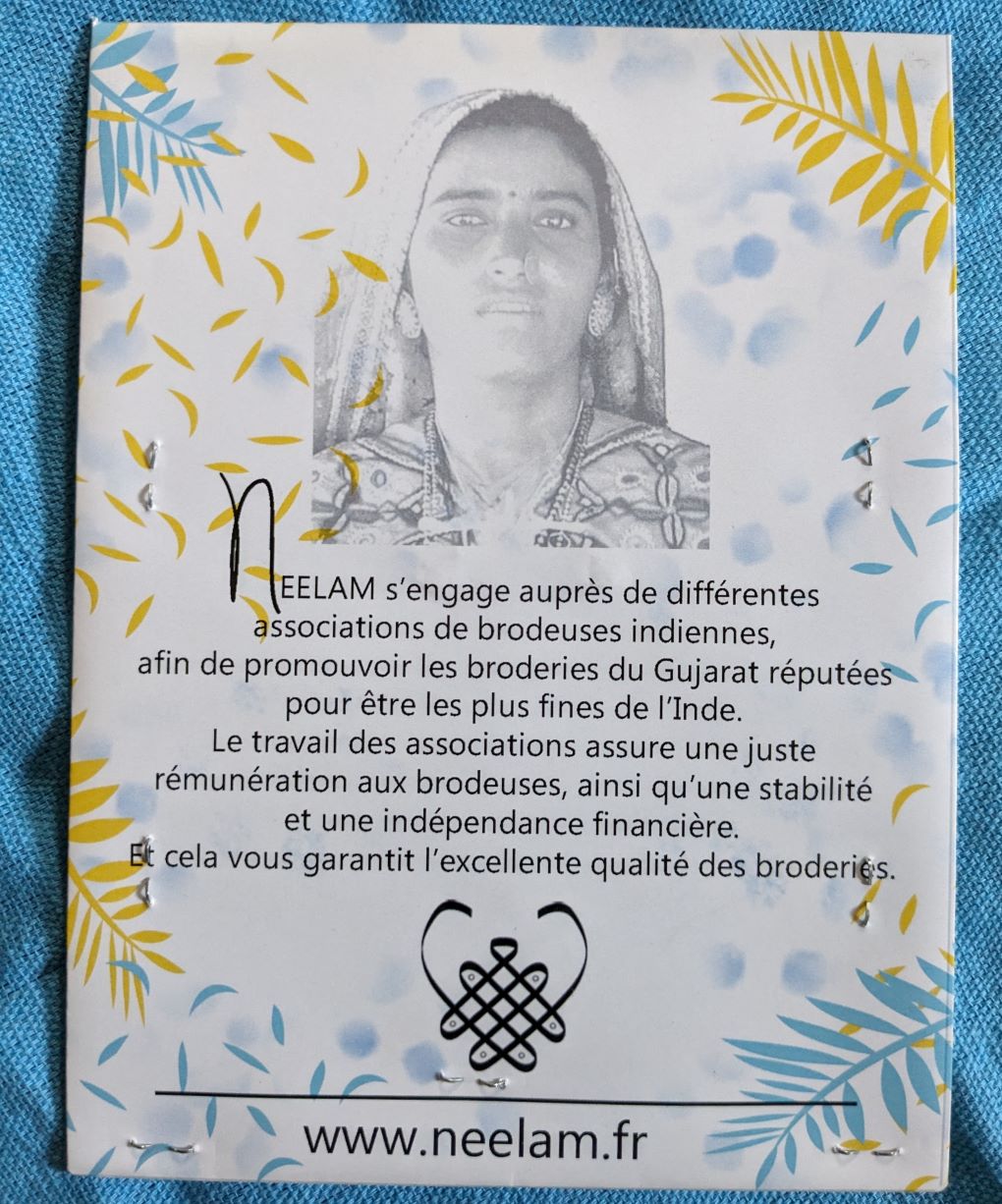 Émilie et Damien ont un stand dans de nombreux Salons d’arts textiles de France (prochainement à Sainte-Marie-aux-Mines, puis à Toulouse au MEETT, voir leur agenda ici). Vous pouvez aussi les rencontrer en JA de France Patchwork, mais aussi commander sur leur site : https://neelam.fr/. Je ne suis pas rétribuée pour la mise en avant de ces fournitures, je suis simplement une fan absolue de cette entreprise Neelam, à la fois du couple qui la fait vivre et de leurs produits beaux, éthiques et ethniques. Ce petit modèle sera également magnifique dans d’autres gammes de tissus, sans broderie ou avec une de Guldusi (afghane) ou encore la vôtre. Cela peut devenir un cadeau parfait pour Noël… C’est assez vite fait et vous ferez plaisir!
