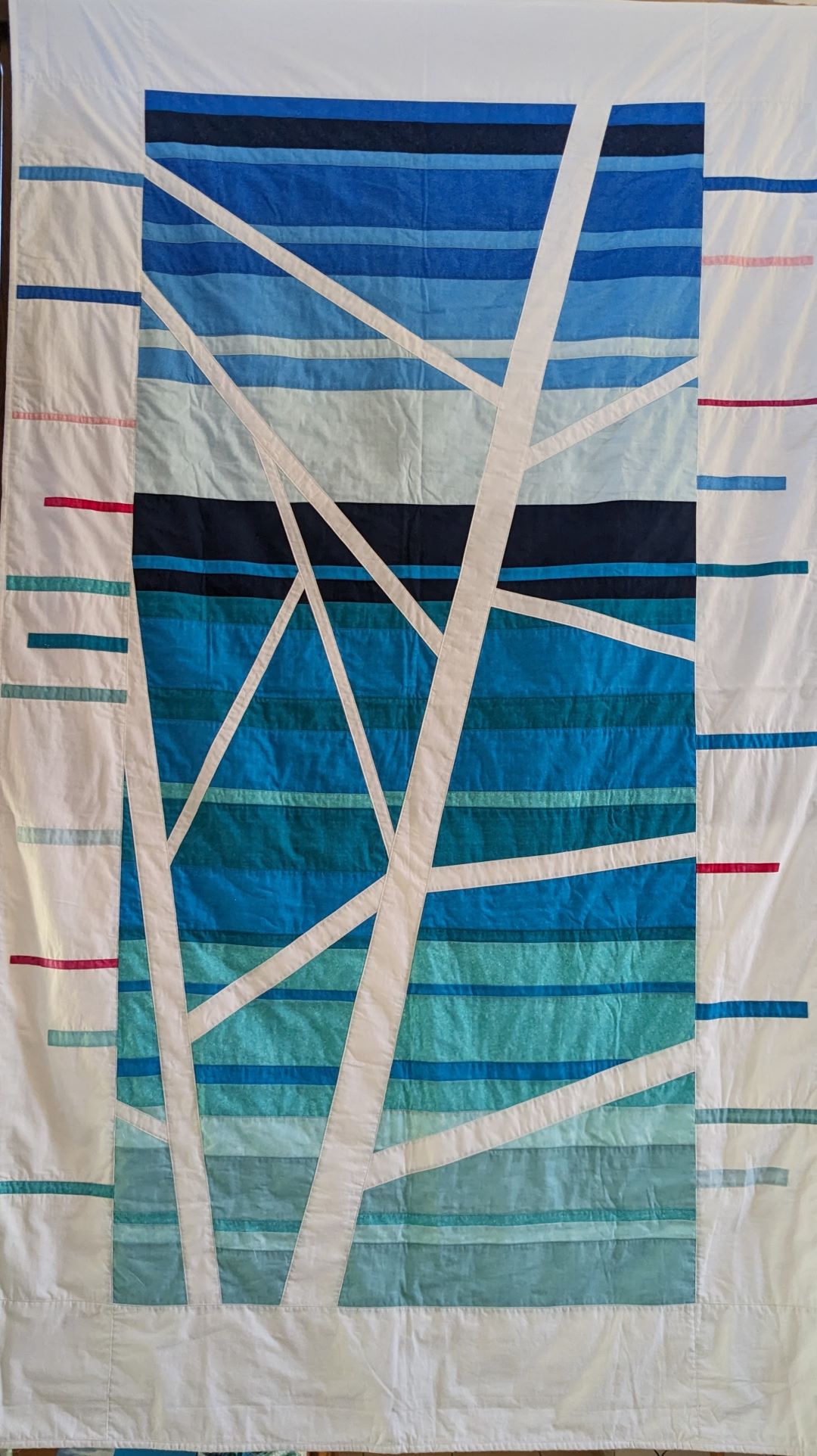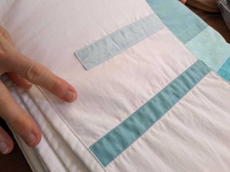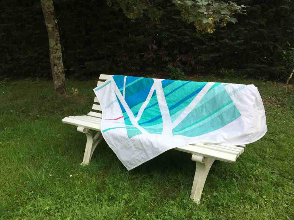 Finalement, le top a été fini en début d’été, et je l’ai quilté à la machine, avec ma fidèle petite Pfaff. Pas de fioritures, j’ai suivi les formes .