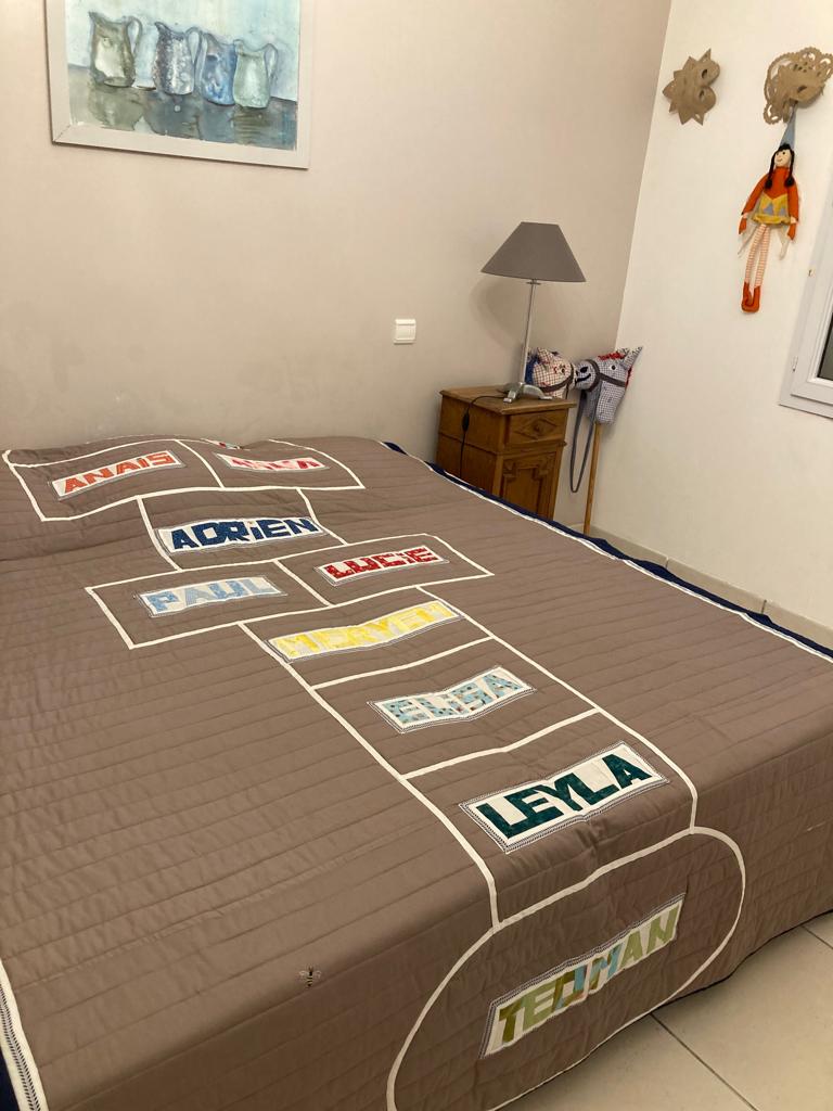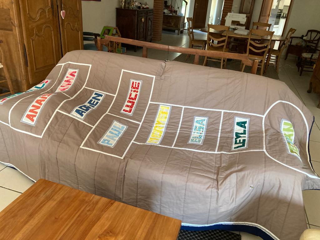 Je m’aperçois que ma marelle aux dix prénoms de mes petits-enfants est pliée dans une armoire… et pour cause ! Je trouve qu’elle se froisse trop… Elle n’est pas assez matelassée et ça me tracasse depuis des mois. Je décide de n’entreprendre aucun autre ouvrage avant d’avoir réglé le problème.