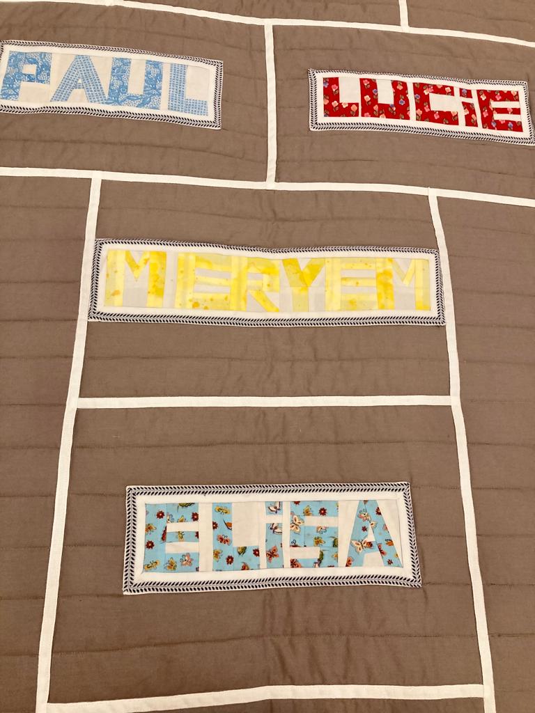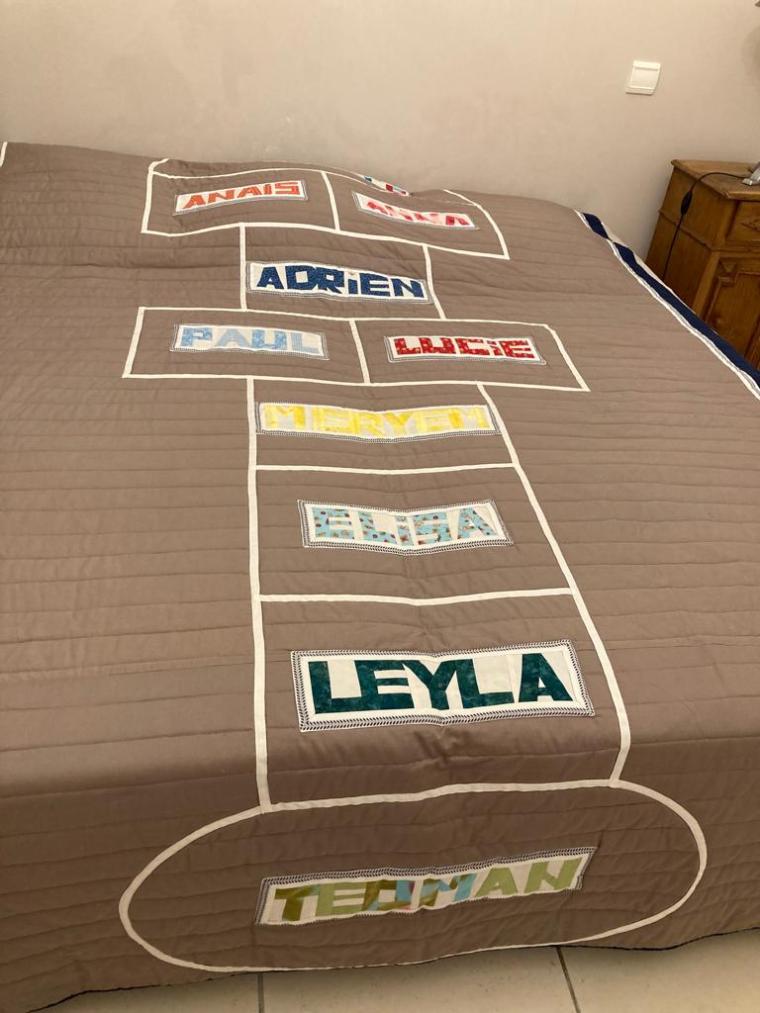J’aime bien ce quilt bleu, il me fait penser à mes feuilles, mais où sont elles ? L’idée des prénoms dans la marelle c’est top bravo