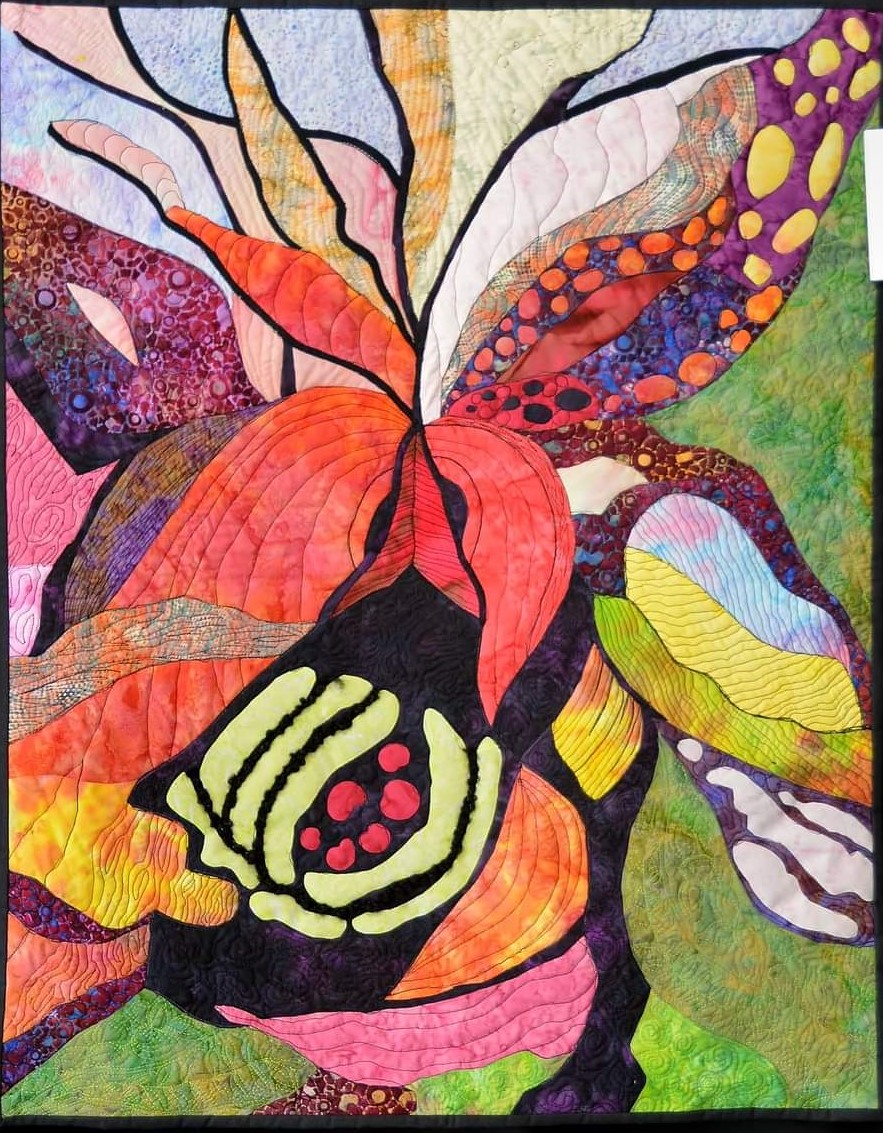 Super, je me réjouis d’avance. Non, il n’y a pas de biais thermocollé, c’est une technique mosaïque de mon invention : un tissu noir de base sur lequel je thermocolle puis coud les petites pièces de tissu batik. Vous le verrez de près à Lacaze et nous aurons l’occasion d’en reparler si vous venez le WE du 22/23 juin.
