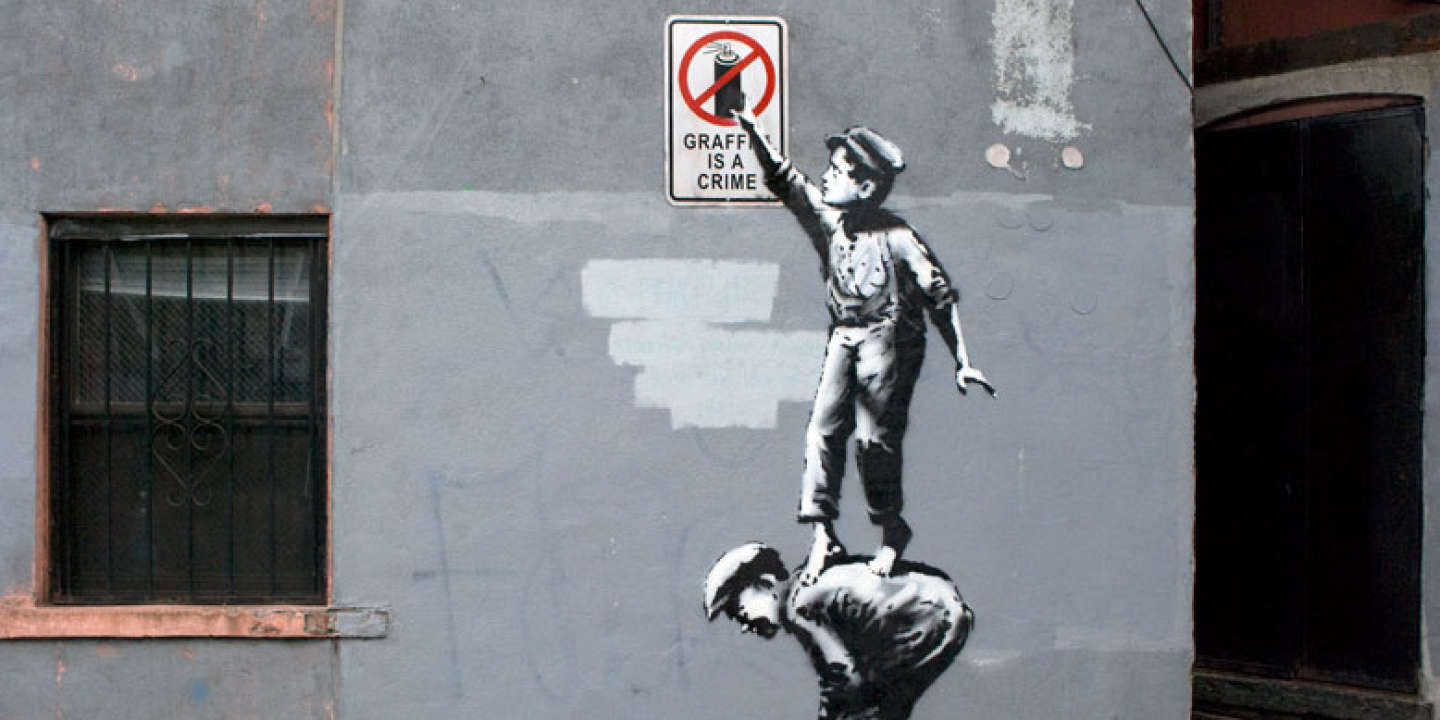 Le monde de Banksy (pseudonyme) est passionnant, il manie à la fois l’humour, la poésie et les revendications antisystème. Son travail est généralement au pochoir, avec quelques touches de couleurs, et parfois quelques mots.