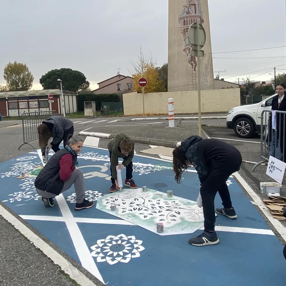 A La Salvetat-St-Gilles (31), en décembre dernier des enfants ont participé à la décoration des places pour handicapés, devant le château d’eau déjà peint mais fort défraîchi, avec la scène du balcon de Roméo et Juliette :