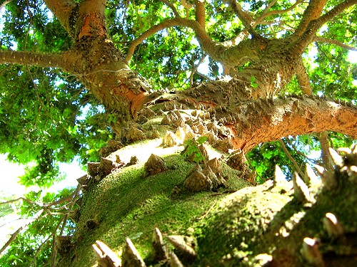 Un arbre remarquable poussait partout dans la forêt primaire côtière de cette terre découverte par les Portugais : le pernambouc en français, qu’on appelait communément le bois-brésil. Deux histoires sur son origine, qui donnera le nom au pays Brésil : les premiers Portugais virent des Natifs danser autour de cet arbre en scandant Brasil-Brasil-Brasil, esprit de la Nature ; l’autre – qui ne contredit pas totalement le premier – est que le bois coupé a la couleur de la braise, un chaud rouge paprika… Ce bois fut exploité jusqu’à sa disparition ou presque d’abord pour ses excellentes qualités tinctoriales (on aimait d’habiller en rouge en Europe !), puis pour la dureté de son bois (pour des meubles). On essaie de replanter cet arbre, car c’est le bois préféré des violonistes virtuoses : aucun bois, aucune résine, aucune fibre naturelle ou synthétique n’égale le pernambouc pour faire des archets (voir violon.com)…