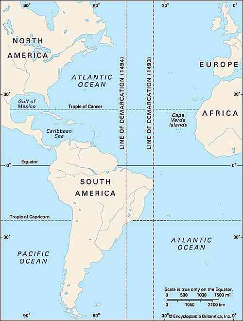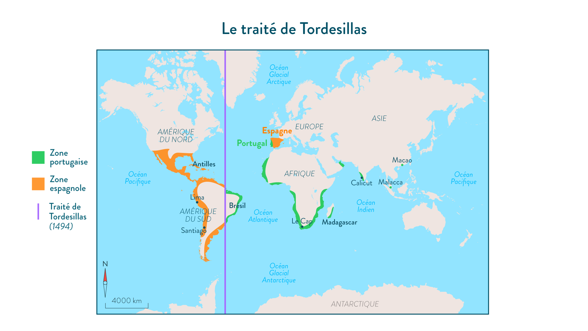 La concurrence pour les nouveaux territoires était féroce entre l’Espagne et le Portugal, et le Pape Alexandre VI (de nationalité espagnole) a partagé le Monde entre Espagnols et Portugais dès 1493. À gauche du méridien dessiné, toutes les nouvelles terres seront espagnoles, à droite elles seront portugaises. Quel égocentrisme !