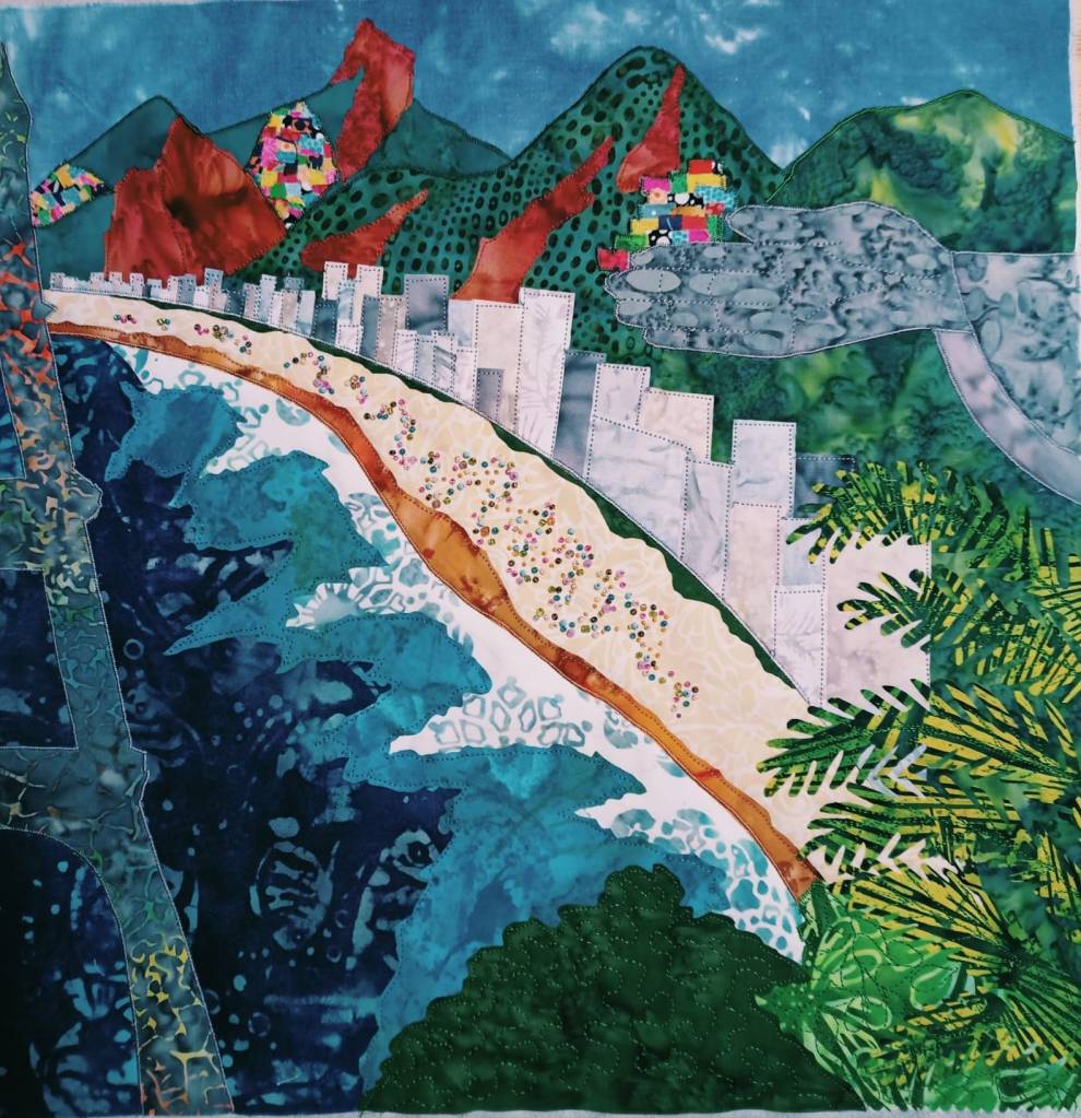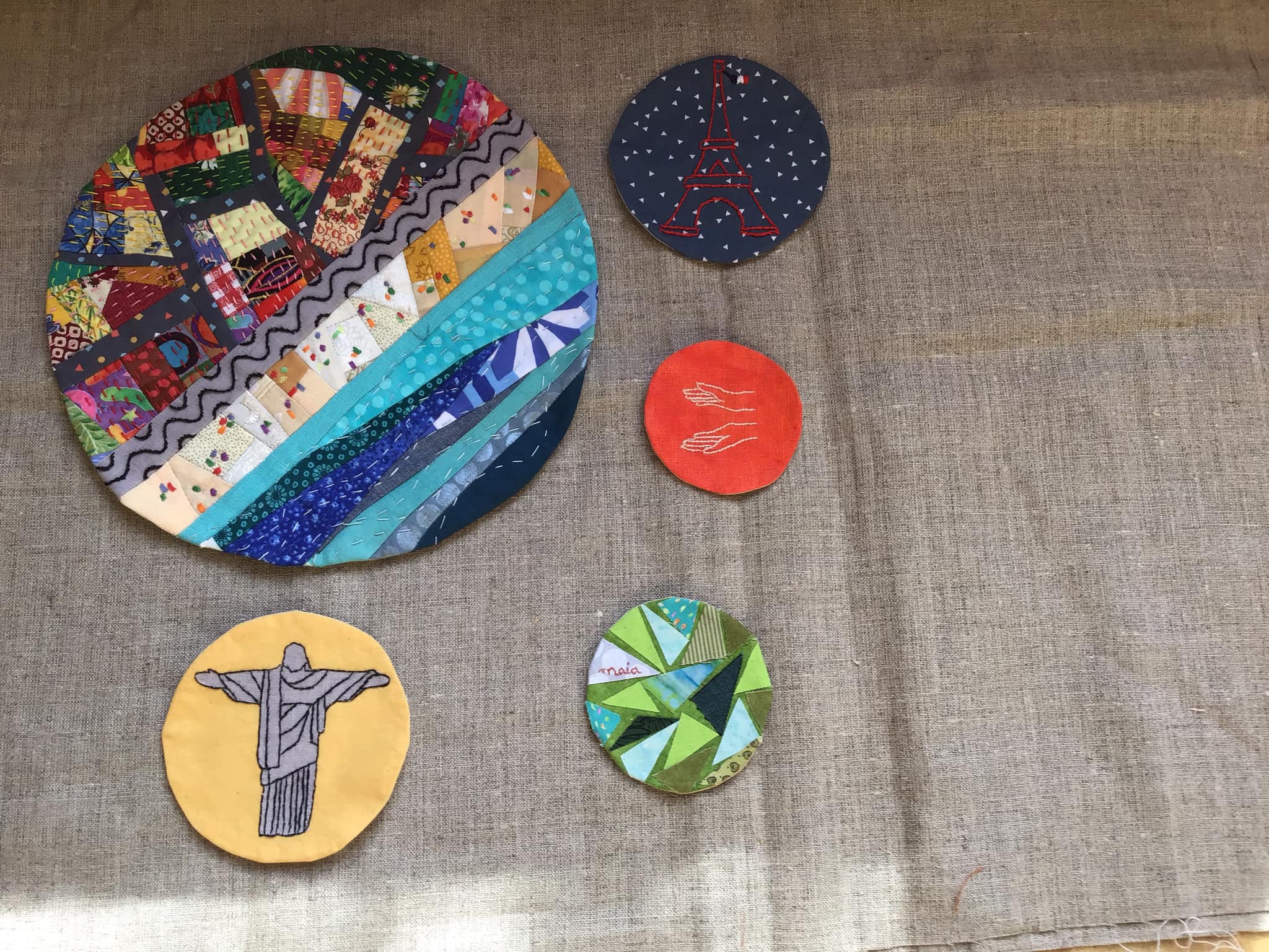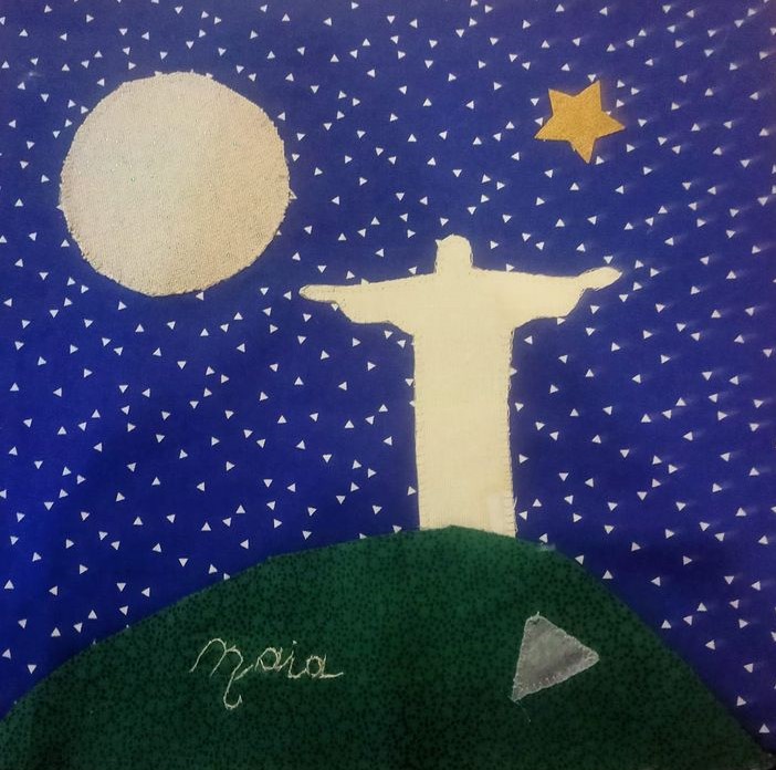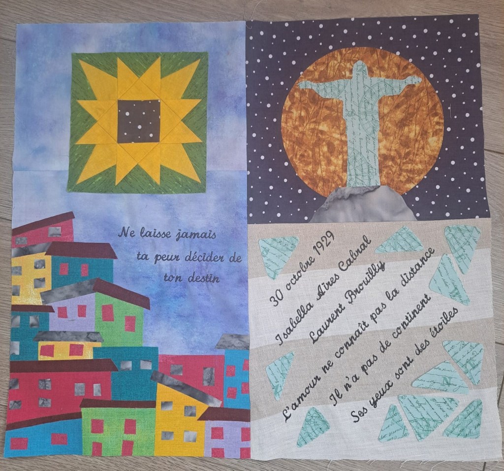 Le groupe La Saga de Lucinda sur Facebook est réservé aux quilteuses désirant participer à ce challenge, qui est de créer un bloc par tome, en vue d’un quilt unique illustrant les Sept Soeurs en textile. Pendant tout le mois d’octobre consacré au tome 1, se sont succédés les premiers balbutiements, les questions sur les formats possibles, les avancées dans la lecture… Chacune suit son rythme ! Nous avons pour la plupart les mêmes thèmes de prédilection, avec en premier lieu le Cristo Redentor, cette statue qui culmine sur le plus haut sommet de la ville (le corcovado, 710 mètres). Puis viennent les favelas, si colorées, certaines dramatiquement pauvres et rongées par les trafics de drogue, d’autres plus pittoresques, toutes faisant un contraste fort avec les maisons aisées d’autres quartiers. C’est la vie.