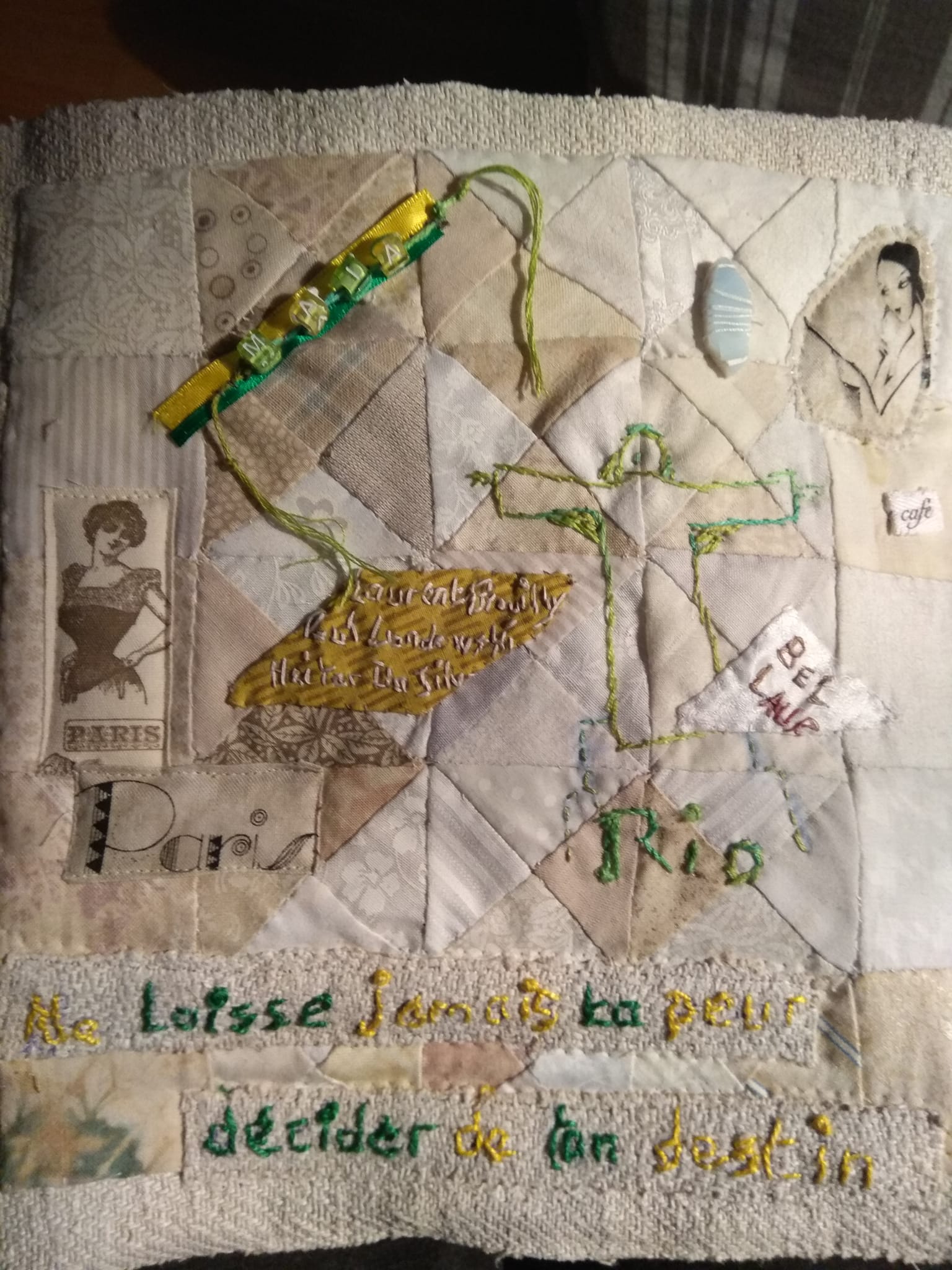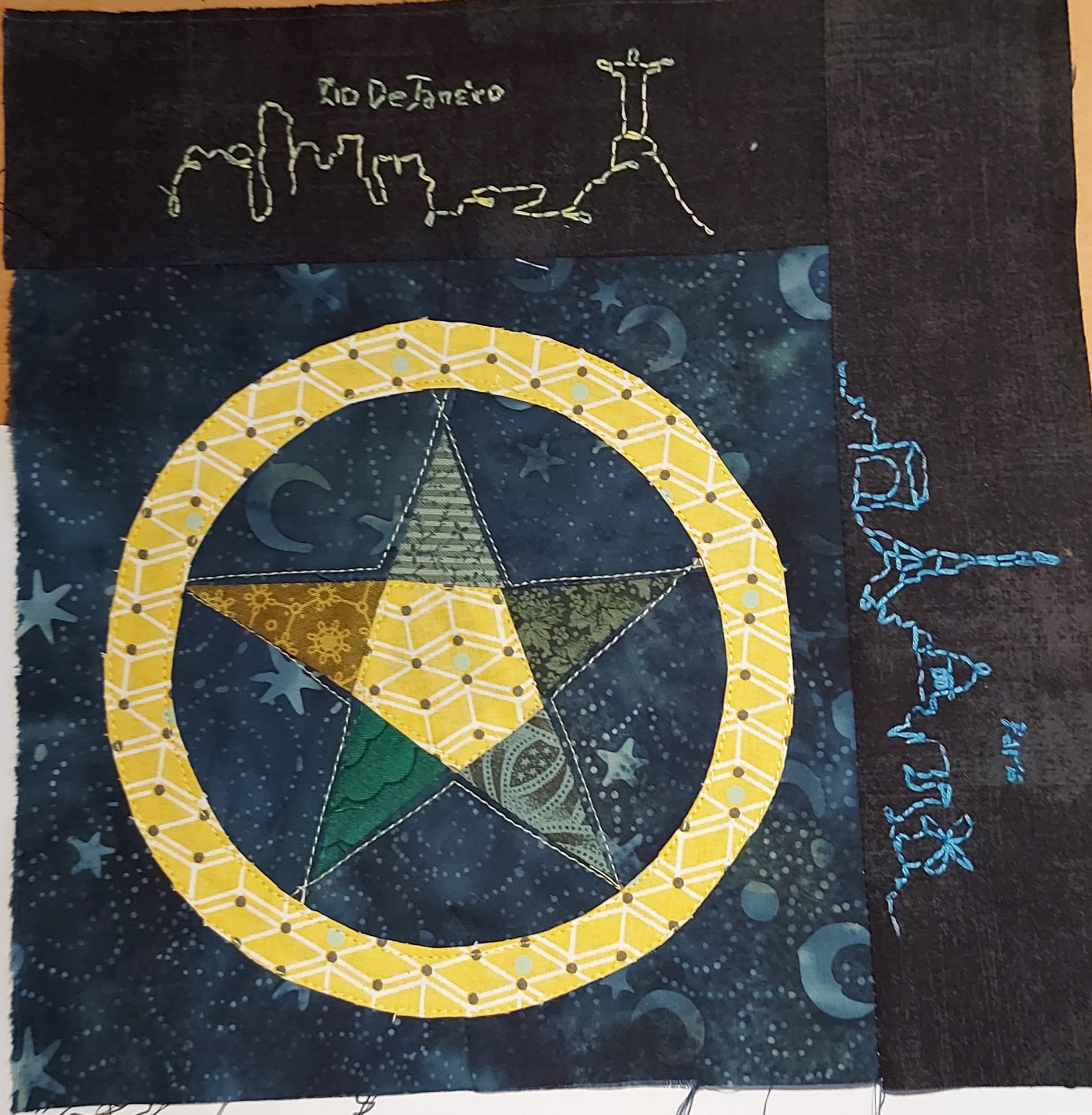 Isabelle Parmain a fait un bloc tout simple, qui parle aux lectrices. Elle y a ensuite ajouté un double cadre, aux couleurs du drapeau brésilien (la seconde photo étant floue, je garde celle-ci).