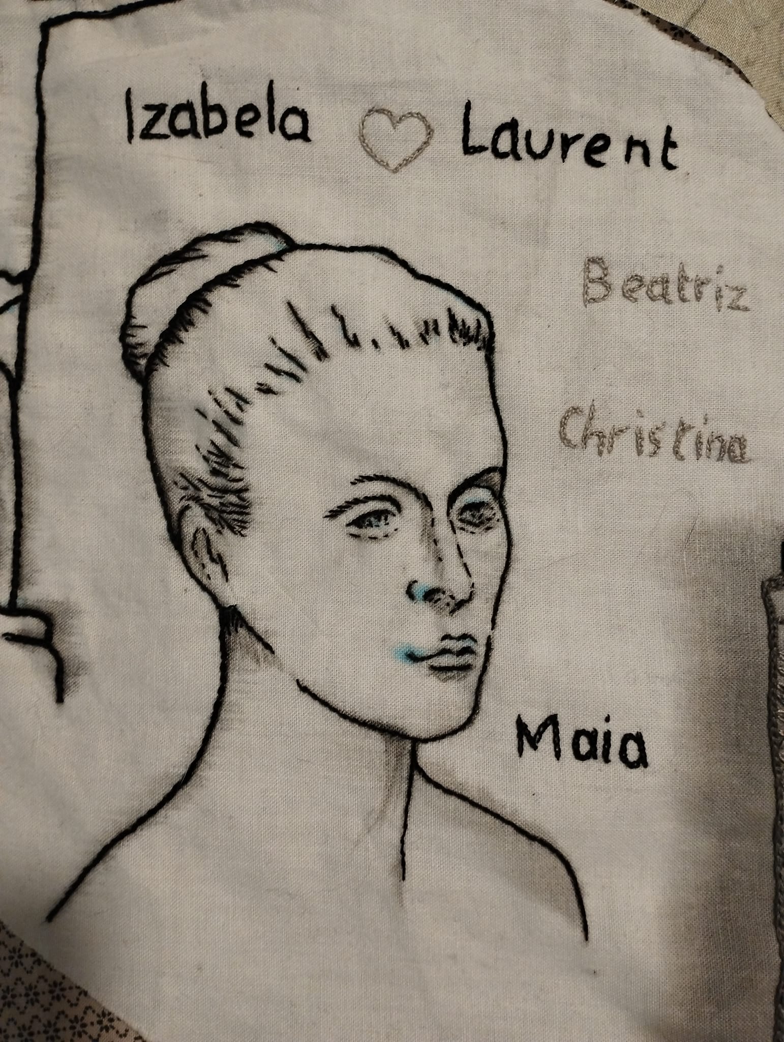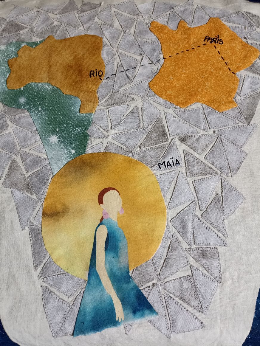 Virginie Lintz : « Voici mon interprétation du premier tome, de la première sœur, MAIA. J’y ai mis mon ressenti, en couleurs. Le Brésil, le vert luxuriant, le jaune du soleil, des sourires. Et bien sûr Paris, pour le créateur (Paul Landowski) de la statue du Christ Rédempteur sur le Corcovado. Et le tissu de fond en Etoile, car bien entendu les 7 sœurs renvoient également à La Pléiade.«