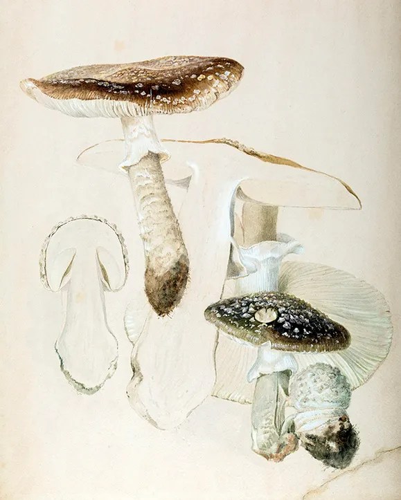 Cette époque victorienne, avec le mouvement Arts & Crafts, favorisait cependant l’observation et l’amour de la nature. Mais pour les femmes, bien sûr, c’est un hobby, un passe-temps ! Mais Beatrix a du potentiel, elle veut étudier, tant de choses l’intéressent, comme la botanique, l’entomologie, l’archéologie aussi… Par amour de la recherche scientifique et de la nature, Beatrix passe de nombreuses saisons à étudier les champignons, les disséquer, les observer au microscope. En excellente dessinatrice, elle crée des planches qui font toujours autorité. Ici l’amanite épaisse et la lépiote à écailles aigues, par exemple :