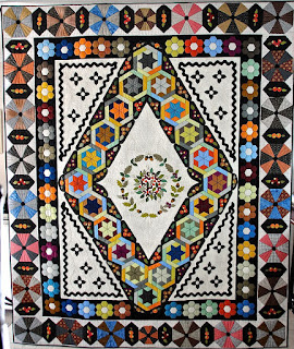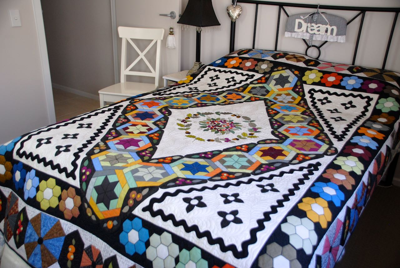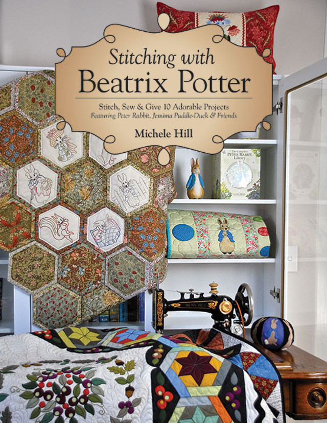 Helen Leech et ses amies ont cousu en 1863, comme cela se faisait souvent dans la bonne société anglaise, un dessus-de-lit pour son mariage avec son fiancé Rupert Potter. Ce sont, vous le devinez, les futurs parents de notre Beatrix. En Angleterre, on utilisait bien sûr la méthode anglaise pour les hexagones mais aussi pour les autres formes (chaque pièce de tissu « emballe » un gabarit de carton, assemblage à points glissés) et l’appliqué, souvent embelli, qui préfigure le crazy victorien. C’est ce qu’on voit sur l’ouvrage original, fait de soies, de velours, de chintz, devenu très fragile, sorti très rarement de sa protection :