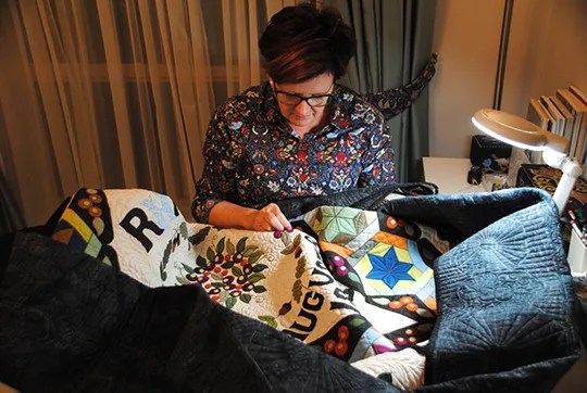 Sa proposition a été très chaleureusement accueillie et donc, elle a ajouté les initiales et date de l’original sur son quilt moderne (quilté machine, brodé machine et main) et il trône depuis peu sur le lit de la maison de Beatrix Potter ! Un beau cadeau qui a du sens.