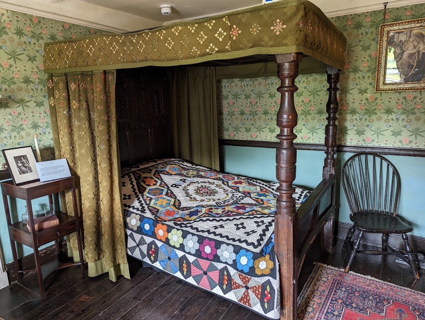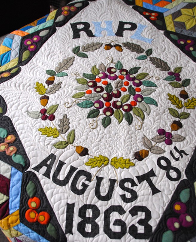 Et alors, le quilt de Hill Top Farm ? C’est le cadeau d’une quilteuse spécialisée dans les Arts & Crafts, Michele Hill. Elle raconte son histoire sur son blog : à partir de quelques photos, elle a fait une reproduction du couvre-lit (coverlet), à l’origine doublé mais pas quilté. Elle a interprété l’original ainsi :