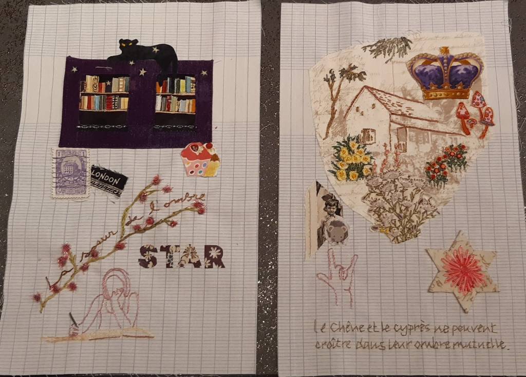 ce troisième tome me rappelait des souvenirs de lecture, Orlando de Virginia Woolf ,Toute passion abolie de Vita Sackeville-West dont j’ai aussi visité le jardin ainsi que le château familial de Knole, donc d´un voyage dans le Kent en particulier. J en ai rapporté un emporte- pièce qui m’a servi à dessiner la silhouette du petit bonhomme , evocation de Rory et du goût de Star pour la pâtisserie. J’ai demandé à mon gendre de me faire un dessin de chat, je ne sais pas bien dessiner . Je le trouve drôle mais trop dominant!!! La page ( 23x 26) ne me plait pas vraiment ,mais tant pis , c’était mon amusement de décembre !