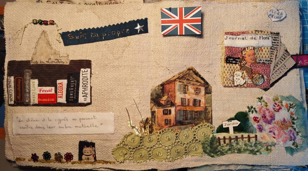 L’autre partie reprend la technique du crazy quilt, les dames de l’époque victorienne récupéraient leurs vieilles robes et ajustaient les morceaux les uns aux autres par des broderies. J’ai voulu évoquer la partie historique du livre et essayé de trouver des tissus rappelant cette période là. Merci aux cravates de Monsieur pour leur contribution.