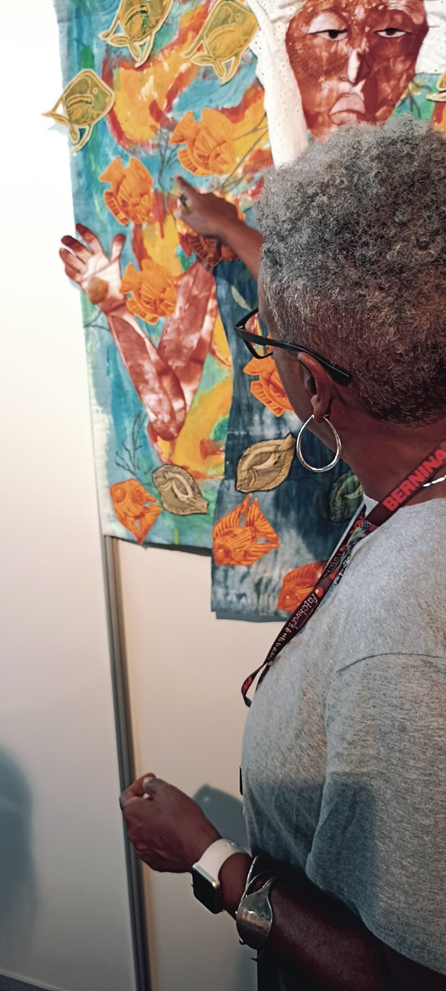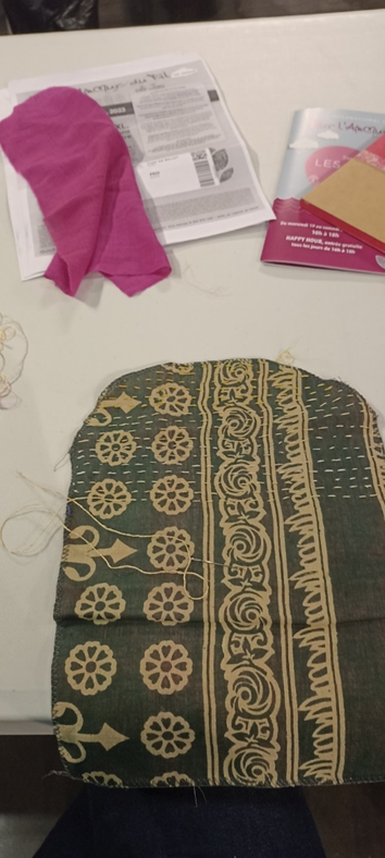 En plus des expositions et de vente de produits, le salon offrait la possibilité de s’inscrire aux cours ou ateliers : j’ai fait une poche “kantha” au fil en soie sur chutes de vêtements façon sari, et aussi un petit tableau, guidée par la talenteuse Galla Grotto, qui en plus exposait ses fabuleux visages de femmes.