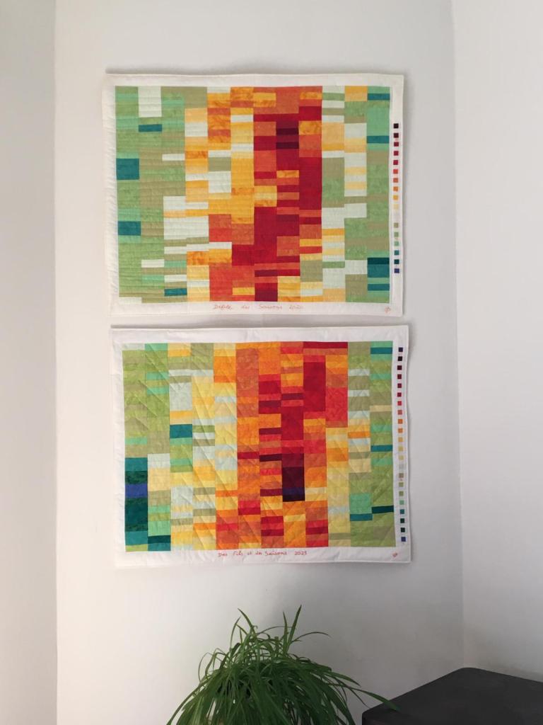 Chantal vient de terminer son quilt-météo ! Son premier de 2020 a été exposé plusieurs fois, et elle a organisé plusieurs expos dans notre petite ville de Pibrac. Fan de ce travail, elle en a commencé un nouveau pour 2024…