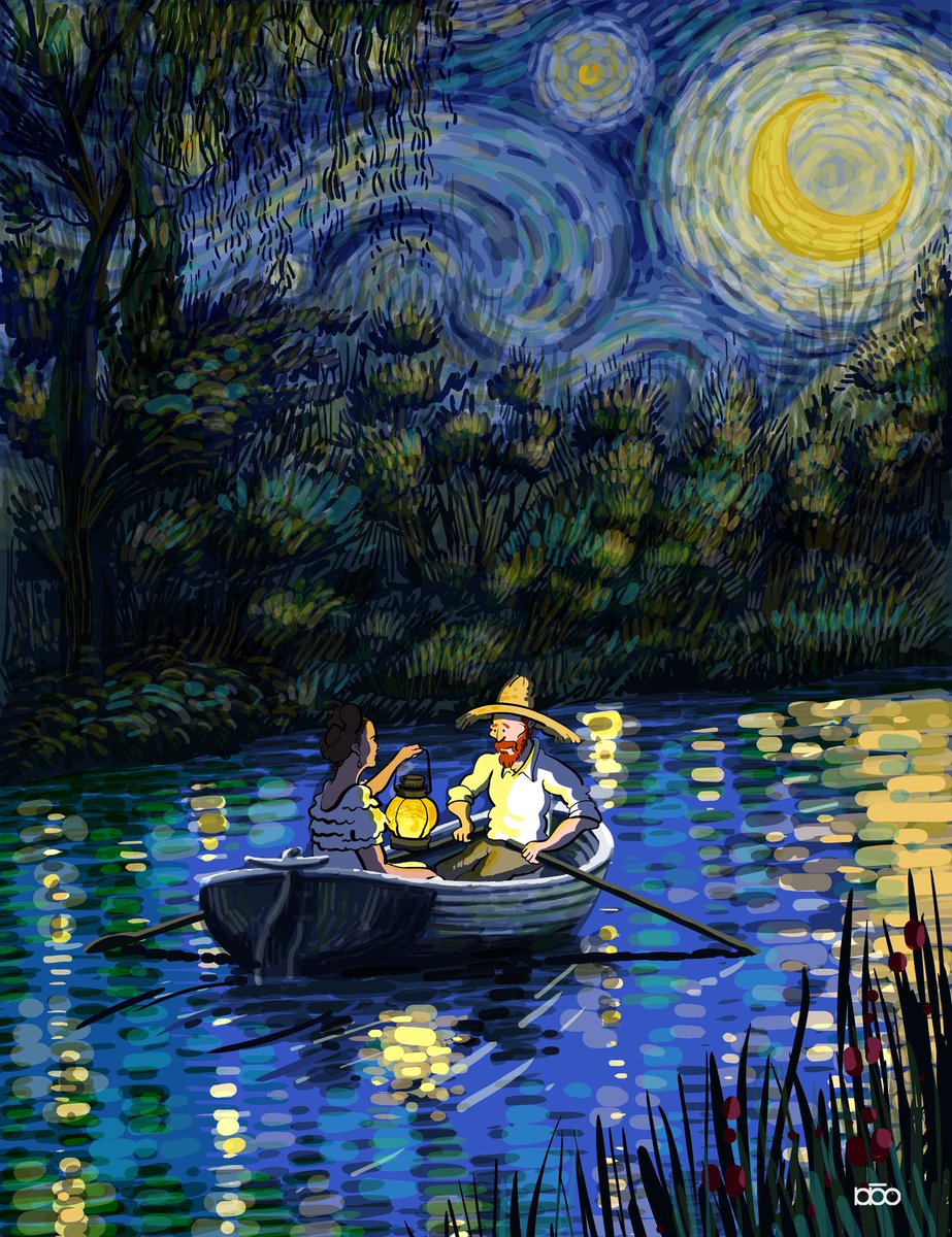 Alireza Moghaddam, Iranien de naissance (1975), vit au Portugal depuis 2021. C’est un peintre digital, c’est-à-dire qu’il dessine et colorie des oeuvres sur écran. Son ami imaginaire, depuis toujours, c’est Vincent Van Gogh. Les réseaux sociaux me l’ont proposé parce que j’aime aussi, passionnément, ce même peintre. Les algorithmes font parfois un travail positif !
