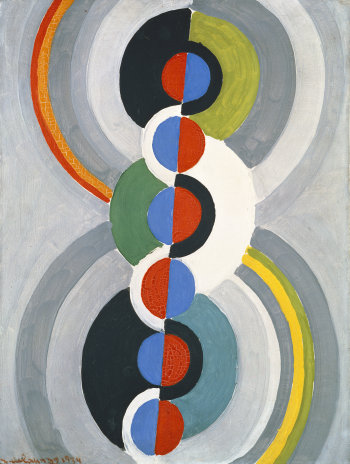 Nous avons donc fait des coupes à main levée avec des tissus se mariant bien avec le lin naturel de fond. L’idée première était une évocation de tableaux des Delaunay, Sonia et Robert (article de Kristine à ce sujet), en particulier ceux-ci :