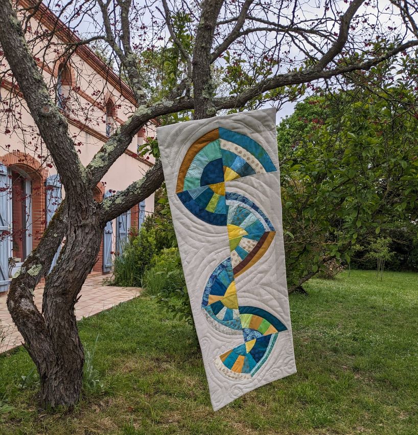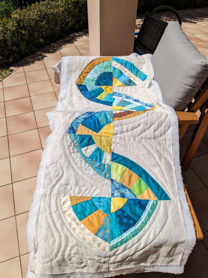 Après le matelassage coloré des quarts de cercles par Andrée, à moi de terminer le quilting et la bordure invisible (explications dans BeeBook) !