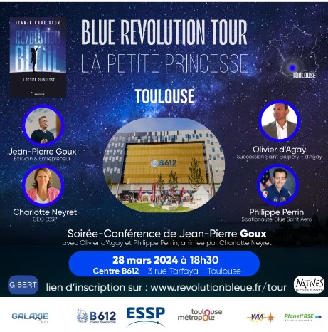 Cette confĂ©rence Ă©tait organisĂ©e pour Jean-Pierre Goux, et l’autre invitĂ© Ă©tait Olivier d’Agay, petit-neveu d’Antoine de Saint-ExupĂ©ry. Que du beau monde ! Des personnes intelligentes, cultivĂ©es, et qui pourtant n’ont pas perdu leur Ăąme d’enfant… Ces trois personnes -Goux, d’Agay, Perrin- Ă©taient rĂ©unies pour le lancement du livre La RĂ©volution Bleue : Petite Princesse. Je l’attendais, ce livre, depuis le temps que JP Goux en parlait avec gourmandise sur Instagram !! Il l’a Ă©crit, réécrit, pour structurer davantage l’ensemble touffu des idĂ©es qu’il voulait caser dans son histoire, qui est comme un conte pour adultes… comme Le Petit Prince ! J’ai beaucoup d’attachement Ă Saint-Ex, et Ă JP Goux.