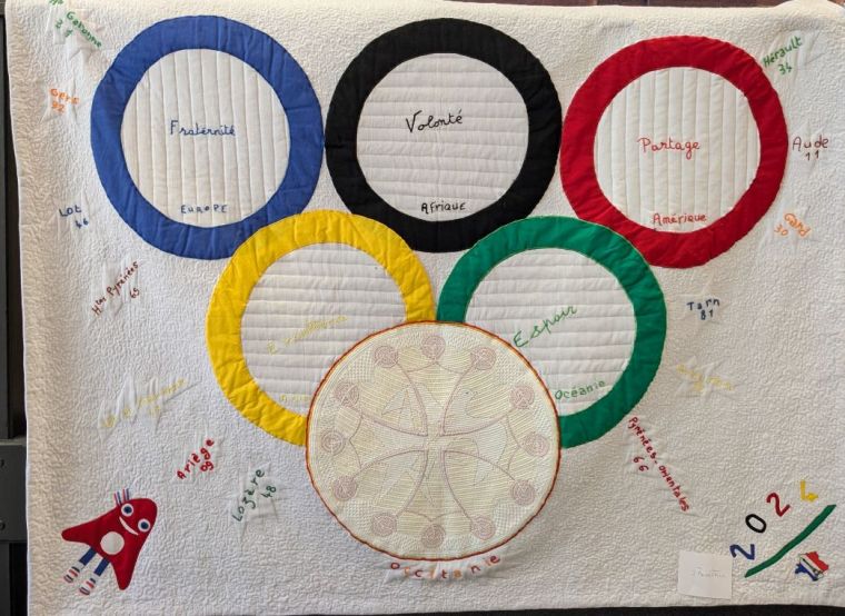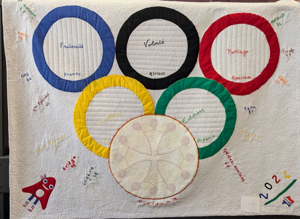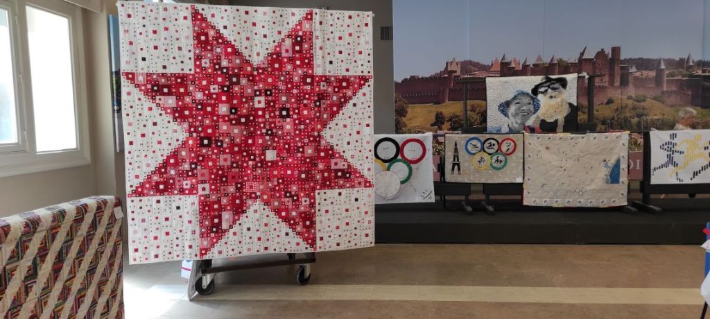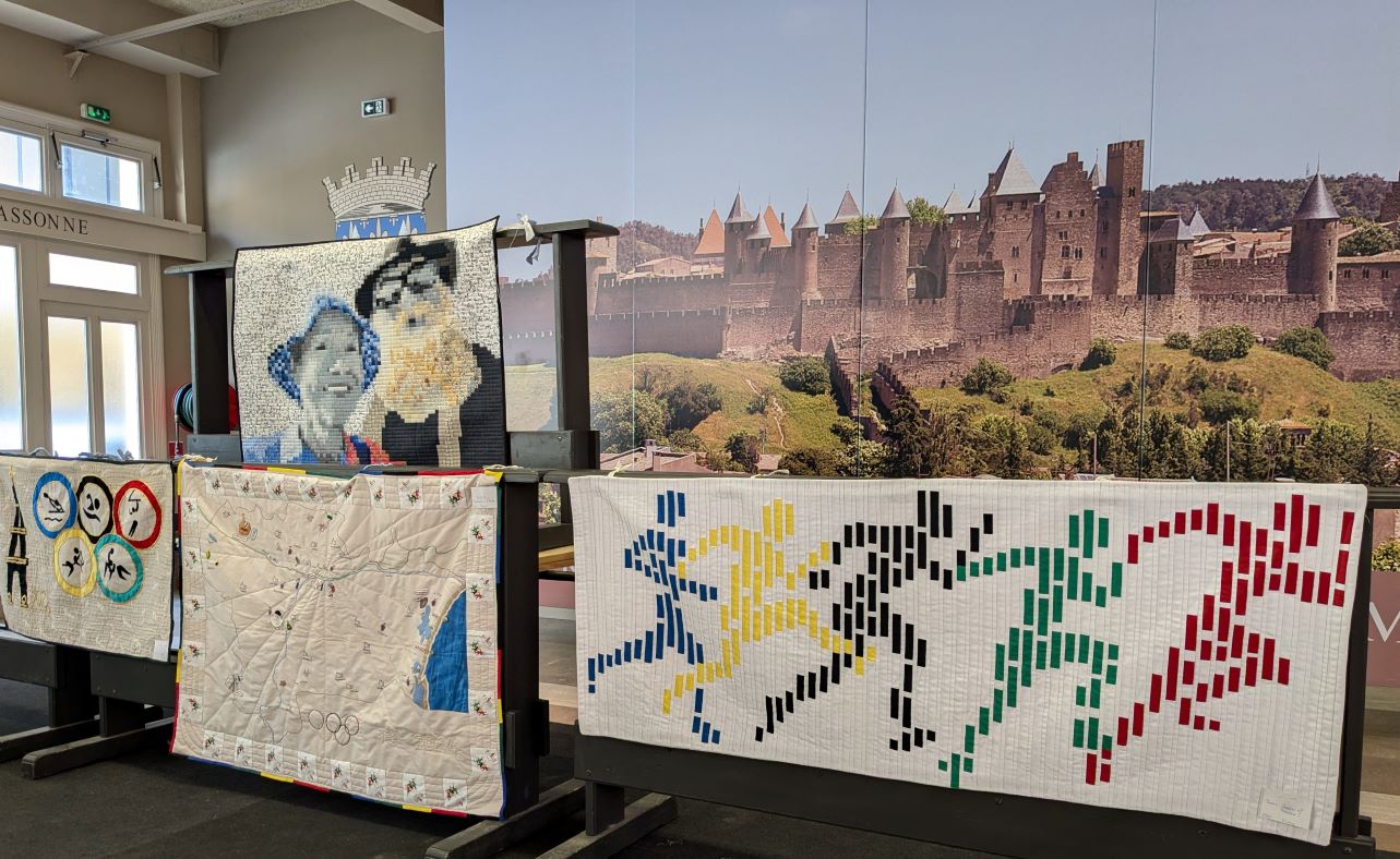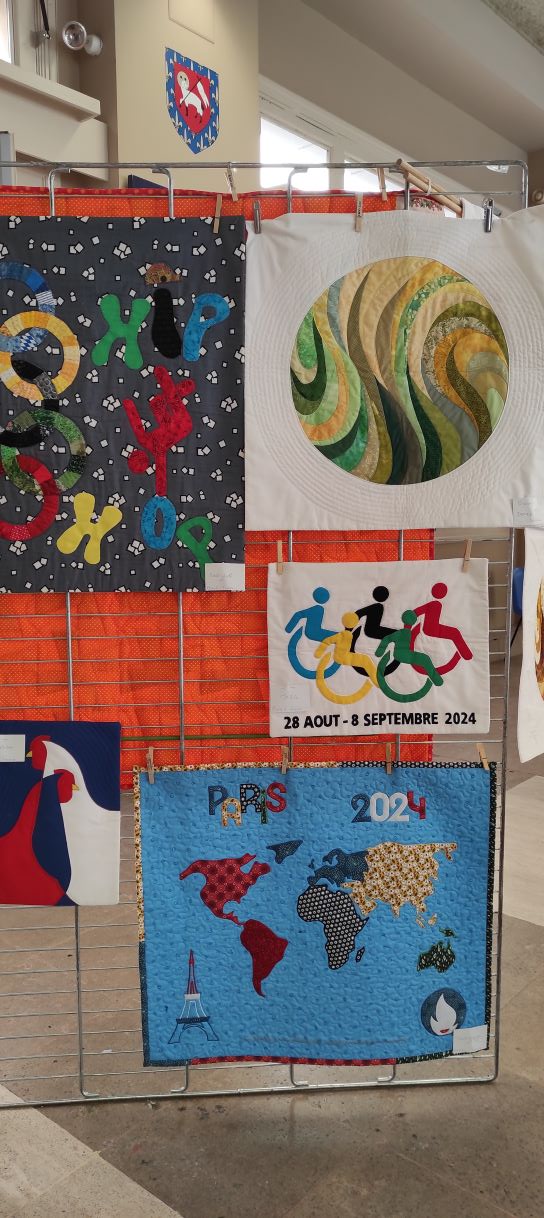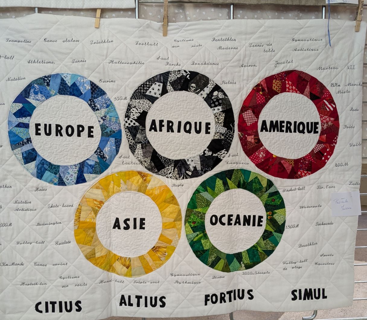 Oh surprise ! Au fond de l’expo, on y voit une dizaine de beaux quilts sur le thème des Jeux Olympiques ! S’il-vous-plaît, ne les dénoncez pas au CIO, qui leur demanderait des droits pour l’utilisation de la devise, des couleurs, des symboles… C’est pour cette raison que France Patchwork n’a pas pu suivre l’idée que j’avais proposée (des quilts sur le thème des J.O.). Elles ne le savaient pas, elles l’ont donc fait :
