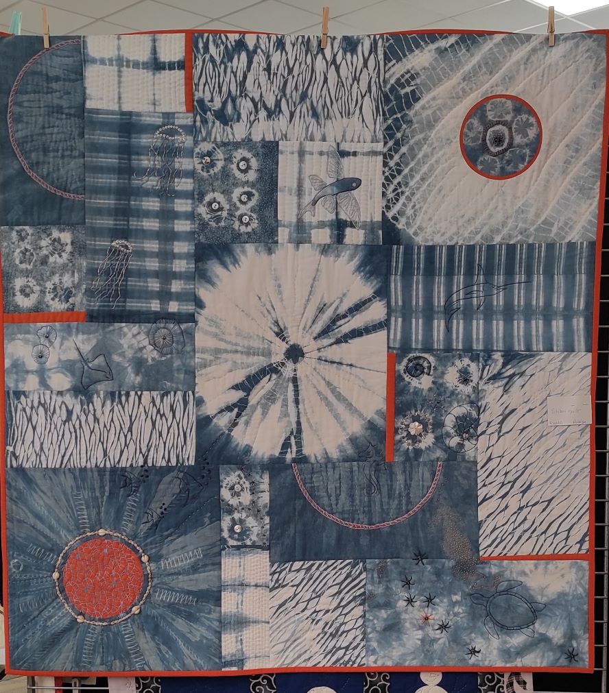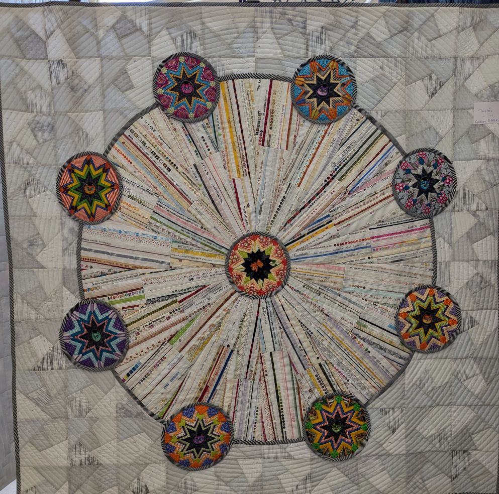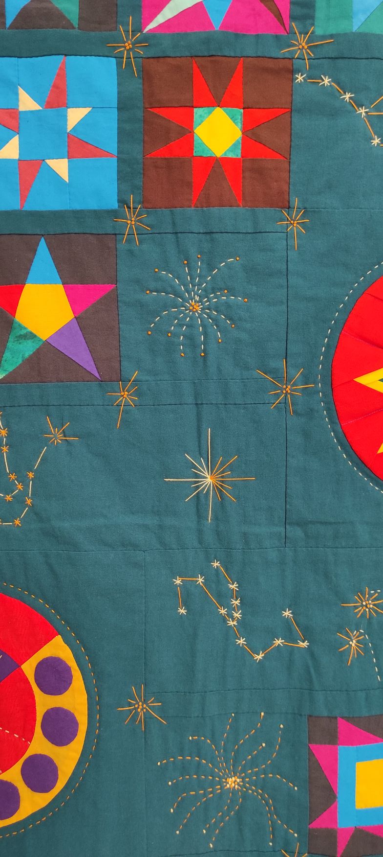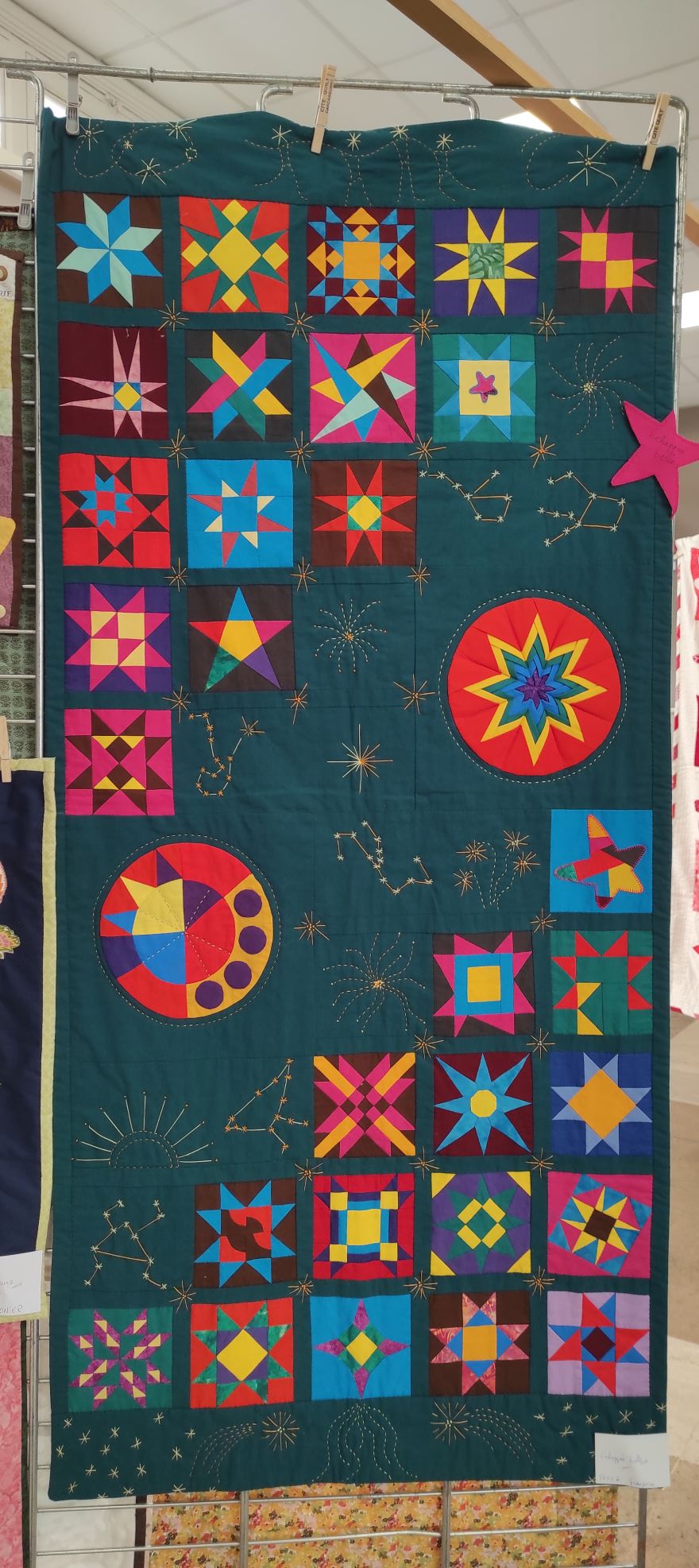 Bien d’autres, de ce club, font aussi de très belles choses, mais je n’ai pas tout photographié ! Vous comprendrez que je me sois focalisée sur celles que je connais. Je voudrais aussi saluer le travail de Françoise Favier, la présidente du club, qui sait maintenir une bonne ambiance et une motivation sans faille ! Pour sa part, elle a participé à un challenge initié par France Patchwork pendant un confinement, elle l’a appelé Échappée Belle. J’adore sa mise en scène des constellations :
