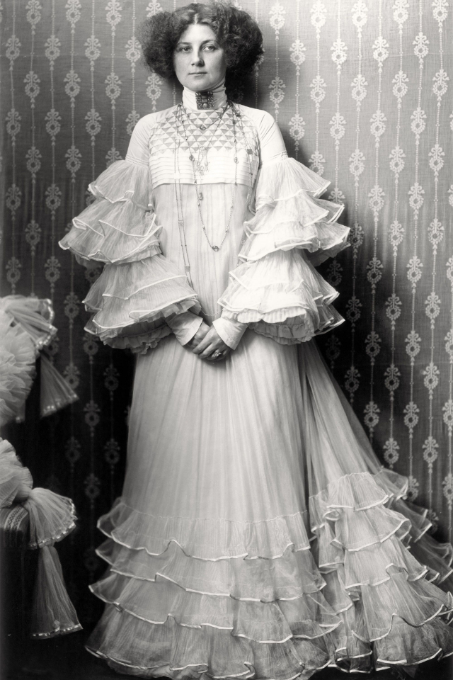 C’est pendant cette révolution artistique que Klimt, grand séducteur, tomba durablement amoureux d’une silhouette longiligne, d’une tignasse flamboyante : Emilie Flöge (1874-1952), sa belle-sœur, couturière de formation, femme d’affaire, styliste de génie, qui fonda avec ses sœurs d’abord une école de couture, puis une maison de couture avant-gardiste en 1904.