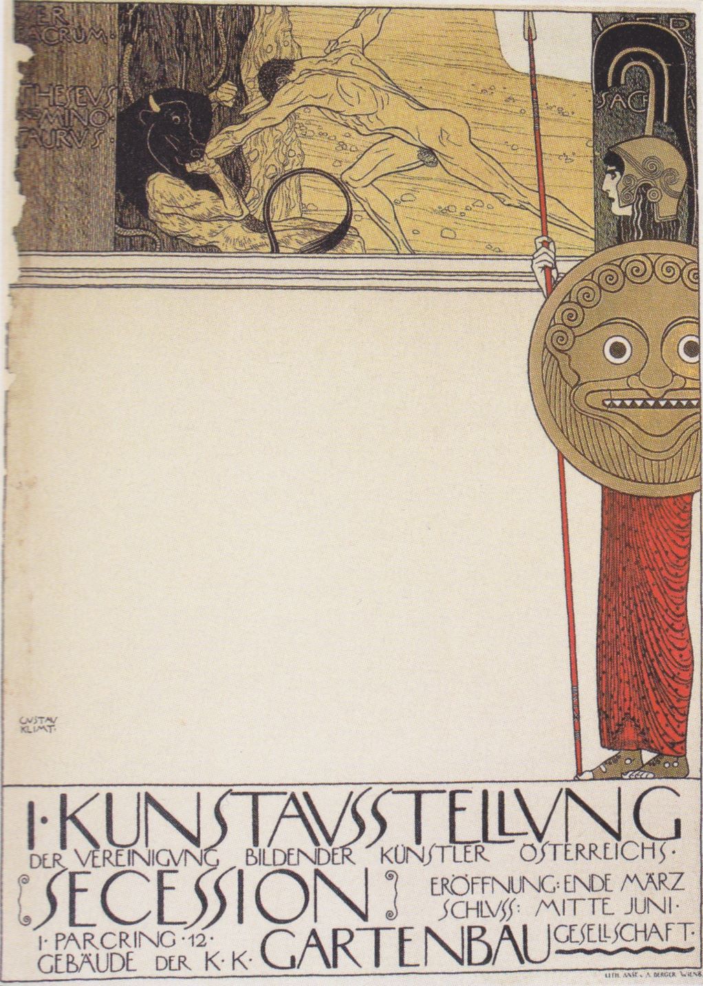Voici le splendide Palais de la Sécession de Vienne, avec sa devise : À chaque époque son art, à tout art sa liberté (je reprends les diverses traductions trouvées pour la devise bien plus ramassée en allemand : Der Zeit ihre Kunst. Der Kunst ihre Freiheit !) et à gauche l’affiche de la première exposition, avec Thésée et le Minotaure, signée Klimt natürlich (1898) :