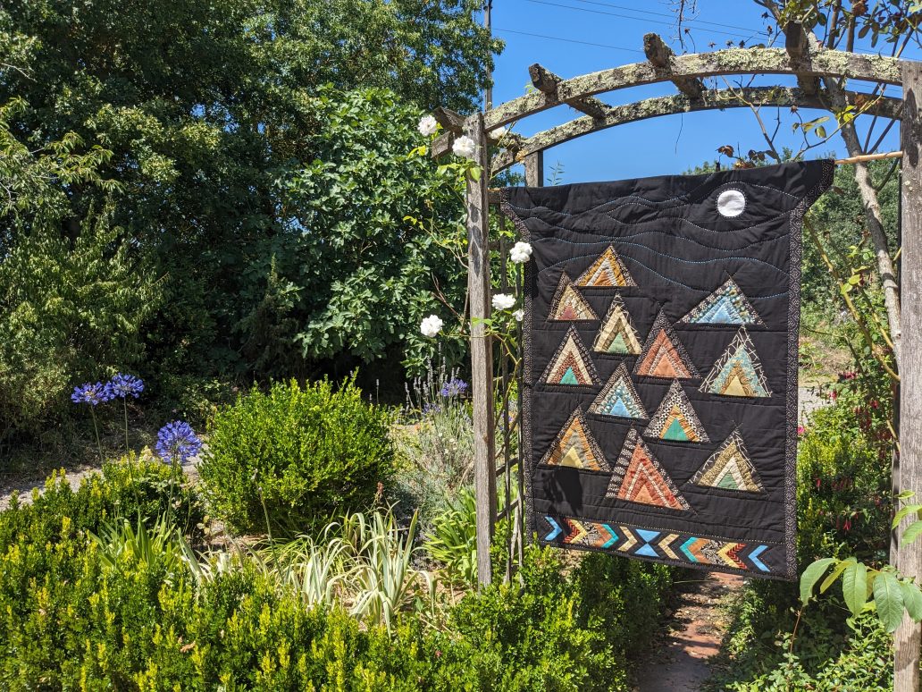 J’associe Klimt aux contrastes mats et brillants, aux jeux de lumière intense. Ce quilt mural réunit des cotons mats et des soies qui accrochent la lumière avec des triangles ressemblant à des tipis, ces petites cabanes qui font rêver tous les enfants, mais aussi des décorations dans plusieurs tableaux de Klimt ! Et il correspond bien à ce peintre, qui n’éprouvait pas le besoin de beaucoup voyager, à part le nord de l’Italie et l’Attersee : Vienne était sa happy place, et vous pouvez visiter avec moi son dernier atelier !