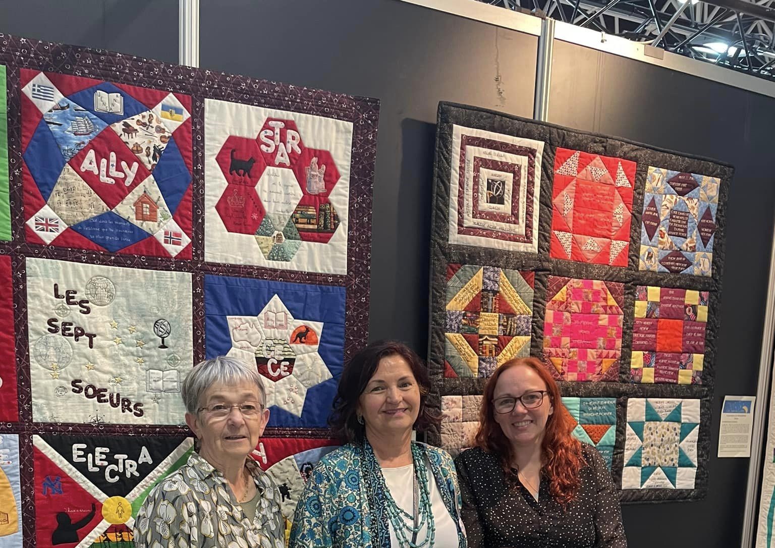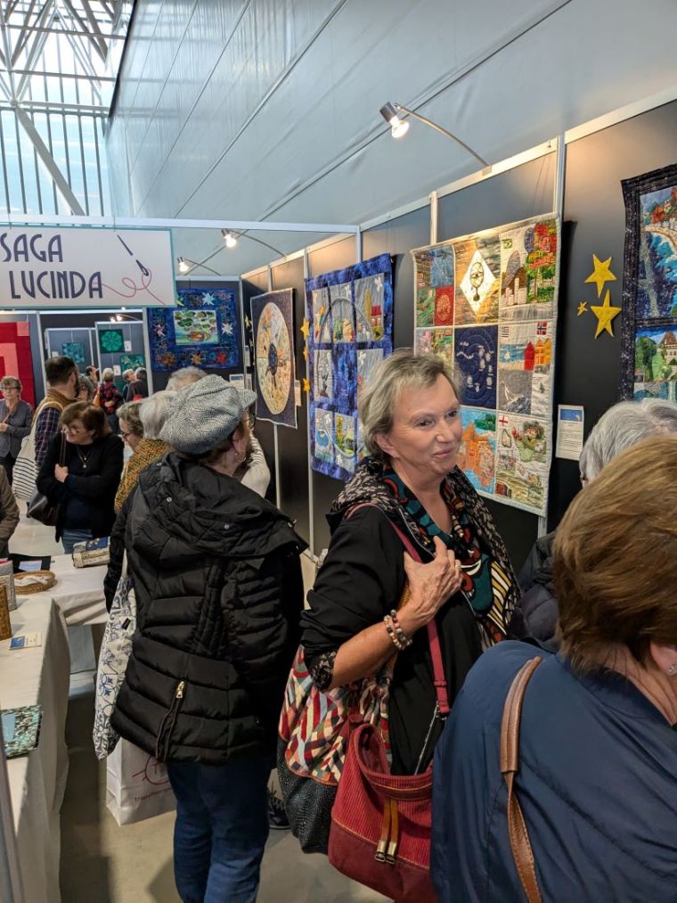 À côté de l’expo ST se trouve la Saga des Sept Soeurs, dont la version textile s’appelle La Saga de Lucinda en hommage à sa créatrice. Cette seconde exposition me tenait au moins tout autant à cœur, puisque depuis un an, des quilteuses courageuses ont bravé près de 5 000 pages d’une saga littéraire (comparable aux 7 tomes de Harry Potter) pour les traduire en formes, en couleurs, avec leurs fils et tissus… Une belle aventure pour chacune, beaucoup de bonne humeur dans ce sacré groupe de Frangines francophones ! Conséquence inattendue, filles et mères, petites-filles et grands-mères se retrouvaient avec la même lecture !