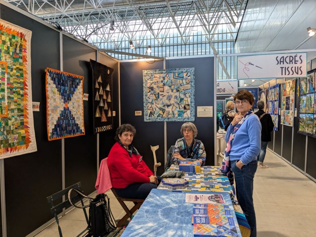 Dans ces deux expositions, nous avons eu deux sortes de demandes réitérées qui sont un signe d’évolution : la demande d’achat de plusieurs quilts – le plus demandé était mon quilt Sacrés Tissus, mais sa place est sur mon lit ! – et, tout aussi encourageante, la demande d’apprendre le B.A. BA du patchwork par des jeunes, filles et garçons. Nous les avons donc redirigés vers France Patchwork bien sûr ! C’est un vrai encouragement pour la considération de certains quilts en tant qu’objets d’art et enfin, allumer l’intérêt des Jeunes pour notre art, et leur confier l’évolution vers de nouvelles aventures… Bientôt, j’en reparlerai !