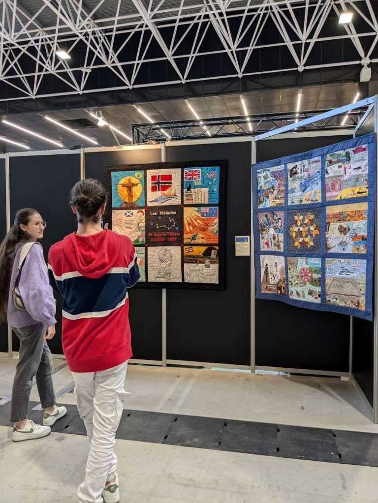 De même, nous avons eu la joie de voir les grands sourires de jeunes – et moins jeunes – femmes venues en touristes aux expositions, mais finalement passer une bonne heure à détailler les blocs des quilts ou les pages des livres textiles (Oh la grenouille d’Edward Grieg ! Oh la danseuse de flamenco !…), discutant avec leurs voisines inconnues, mais liées par leurs lectures !