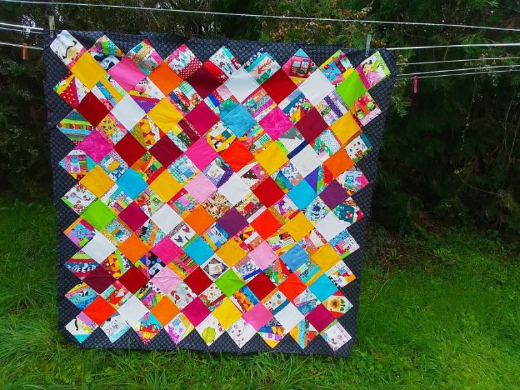 Voici ma 1ère réalisation issue du livre ST. Au début j’étais très contente car mon sac de chutes fondait à vue d’œil… et je viens d’en trouver 2 autres, de quoi réaliser d’autres modèles tout aussi colorés. Je pense broder le prénom de mes copines qui me gardent toutes leurs chutes sur les blocs unis et je leur ai proposé d’organiser une journée spéciale MAC, pour qu’elles acquièrent cette technique d’improvisation qui leur fait tant peur !