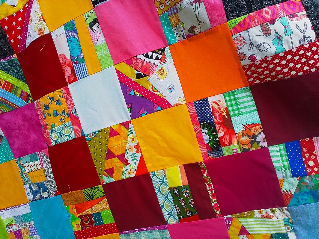 Voici ma 1ère réalisation issue du livre ST. Au début j’étais très contente car mon sac de chutes fondait à vue d’œil… et je viens d’en trouver 2 autres, de quoi réaliser d’autres modèles tout aussi colorés. Je pense broder le prénom de mes copines qui me gardent toutes leurs chutes sur les blocs unis et je leur ai proposé d’organiser une journée spéciale MAC, pour qu’elles acquièrent cette technique d’improvisation qui leur fait tant peur !