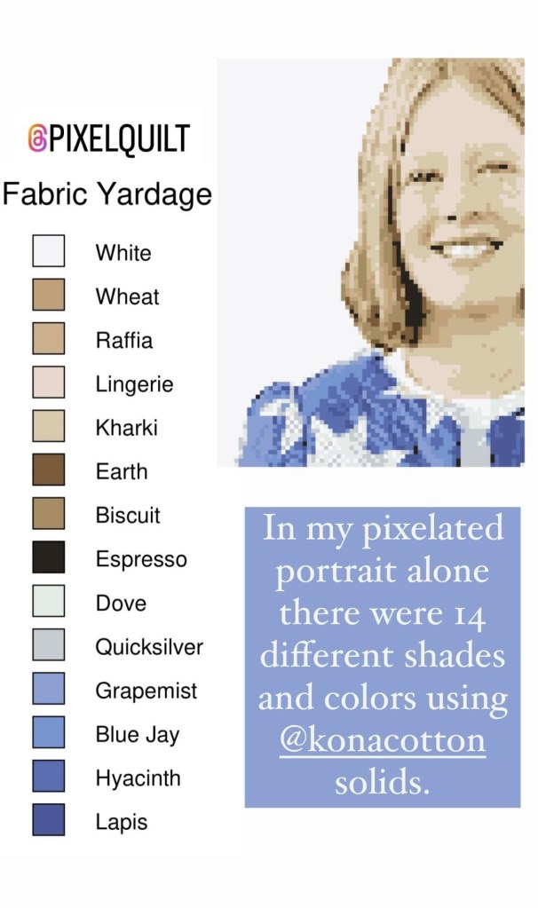 On en reçoit un schéma et une charte de couleurs, avec la correspondance en tissus unis de la gamme Kona Cotton (ou d’une autre gamme, au choix). Ensuite, il faut beaucoup d’attention et de patience pour réaliser le portrait en assemblant les centaines ou milliers de morceaux de tissus !