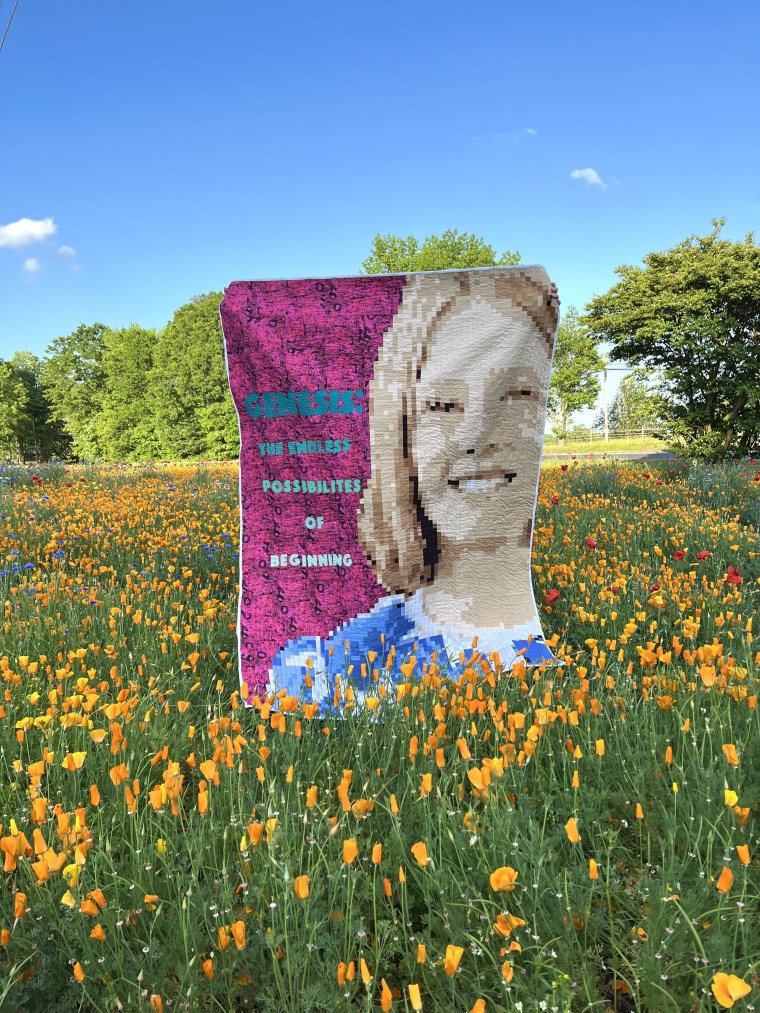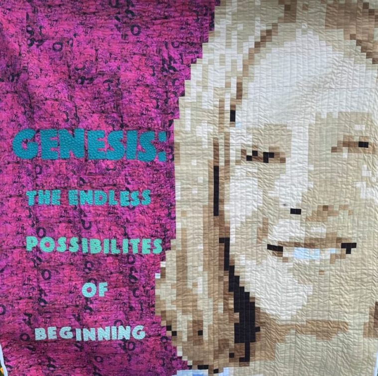 Une fois la photo pixellisée traduite en tissus, Genesis devait trouver un fond qui ait du sens. Le tissu violine pour faire ressortir son portrait la satisfait, mais il manquait le fameux lien avec son prénom et la nouvelle génération de quilteuses, qu’elle appelle, elle aussi, de ses vœux. Ce sera cette phrase devenue fameuse :