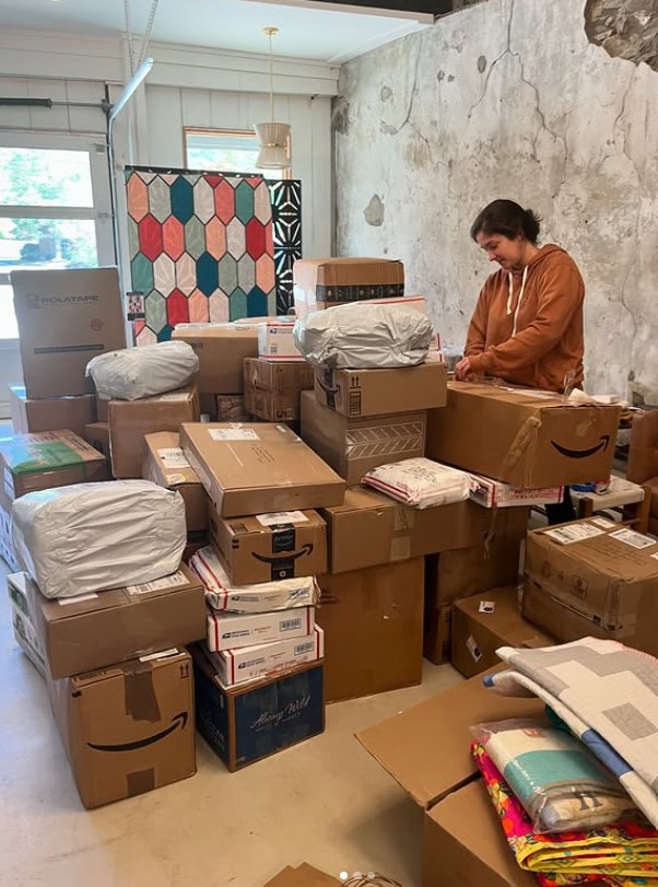 Je tiens à remercier Genny, qui m’a fourni textes et photos, a relu les articles pour approbation avant leur publication. J’ajoute que son mois d’octobre a été marqué par plusieurs jours de bénévolat envers les victimes de l’ouragan dévastateur Helene, fin septembre 2024, en particulier dans son Etat, la Caroline du Nord. Un magasin de tissus et fournitures de patchwork (@loandbeholdstitchery) a collecté un nombre impressionnant de quilts offerts, et, à l’aide de bénévoles comme Genesis et sa mère, ils ont été apportés aux sinistrés. En Europe, on considère bien souvent que seuls les dons d’argent sont utiles, et pratiques. Aux USA, dans des circonstances équivalentes, la distribution de quilts est bien plus appréciée que chez nous, un quilt est reçu comme un trésor, fait d’amour. Nous n’avons pas la même culture. Voyez la générosité des quilteuses, qui envoient des centaines de quilts à distribuer aux sinistrés, et Genny qui aide à la distribution :